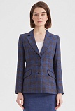 Классический жакет в клетку в благородной цветовой гамме из поливискозной ткани с меланжевым эффектом, получаемый путем смешивания нитей разных оттенков, создавая неоднородную окраску, слегка удлиненный, приталенный, однобортный, английский воротник, прорезные карманы с клапаном, прямой борт, застежка на пуговицы, длинный втачной рукав, тонкие подплечники, модель на подкладке. Поливискозная ткань - смесовая ткань, в состав которой входят волокна вискозы и полиэстера.