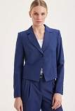 Короткий жакет в элегантном синем цвете из поливискозной ткани с мелкозернистым рисунком, придающий изделию дорогой вид и особый лоск, приталенный, однобортный, английский воротник, без карманов и лишнего декора, застежка на одну пуговицу, небольшой декоративный элемент в виде  разреза в среднем шве спинки придает изделию особый шарм и оригинальность, длинный втачной рукав с декоративной шлицей и рядом мелких пуговиц, тонкие подплечники, модель на подкладке в цвет изделия.