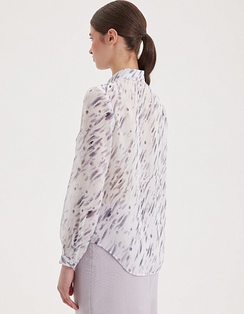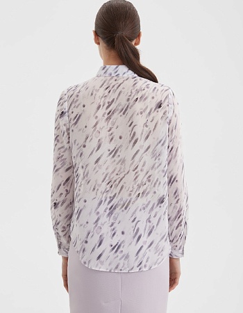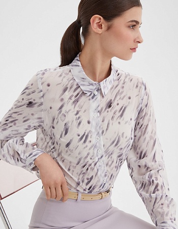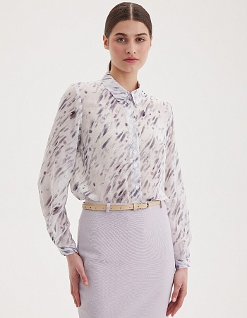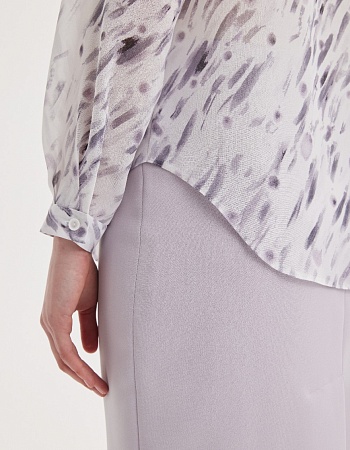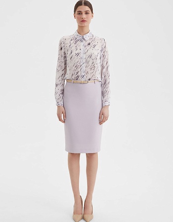 Элегантный и изысканный жакет из поливискозной ткани в пастельном оттенке лилового цвета, средняя длина, приталенный, однобортный, фигурные рельефы, небольшой воротник стойка и прорезные карманы с клапаном украшены отделкой из ткани компаньона более яркого цвета, застежка на одну пуговицу, длинный втачной рукав с разрезом, который позволяет изменить длину рукава, тонкие подплечники, модель на подкладке.
