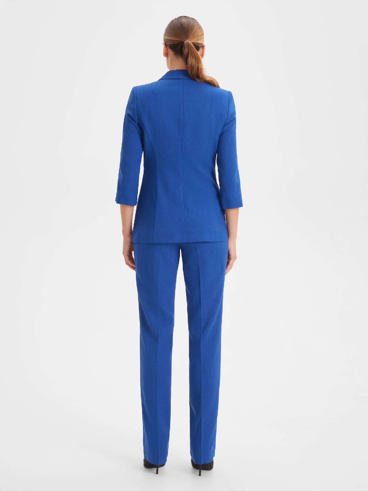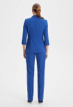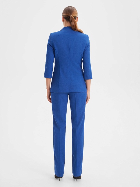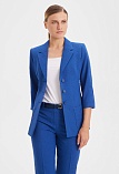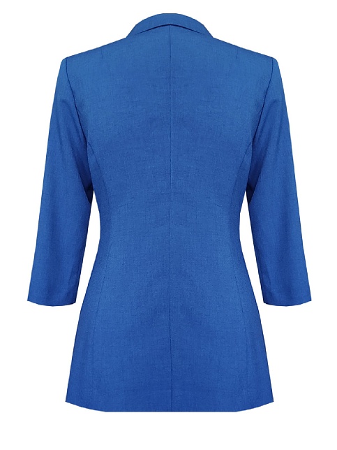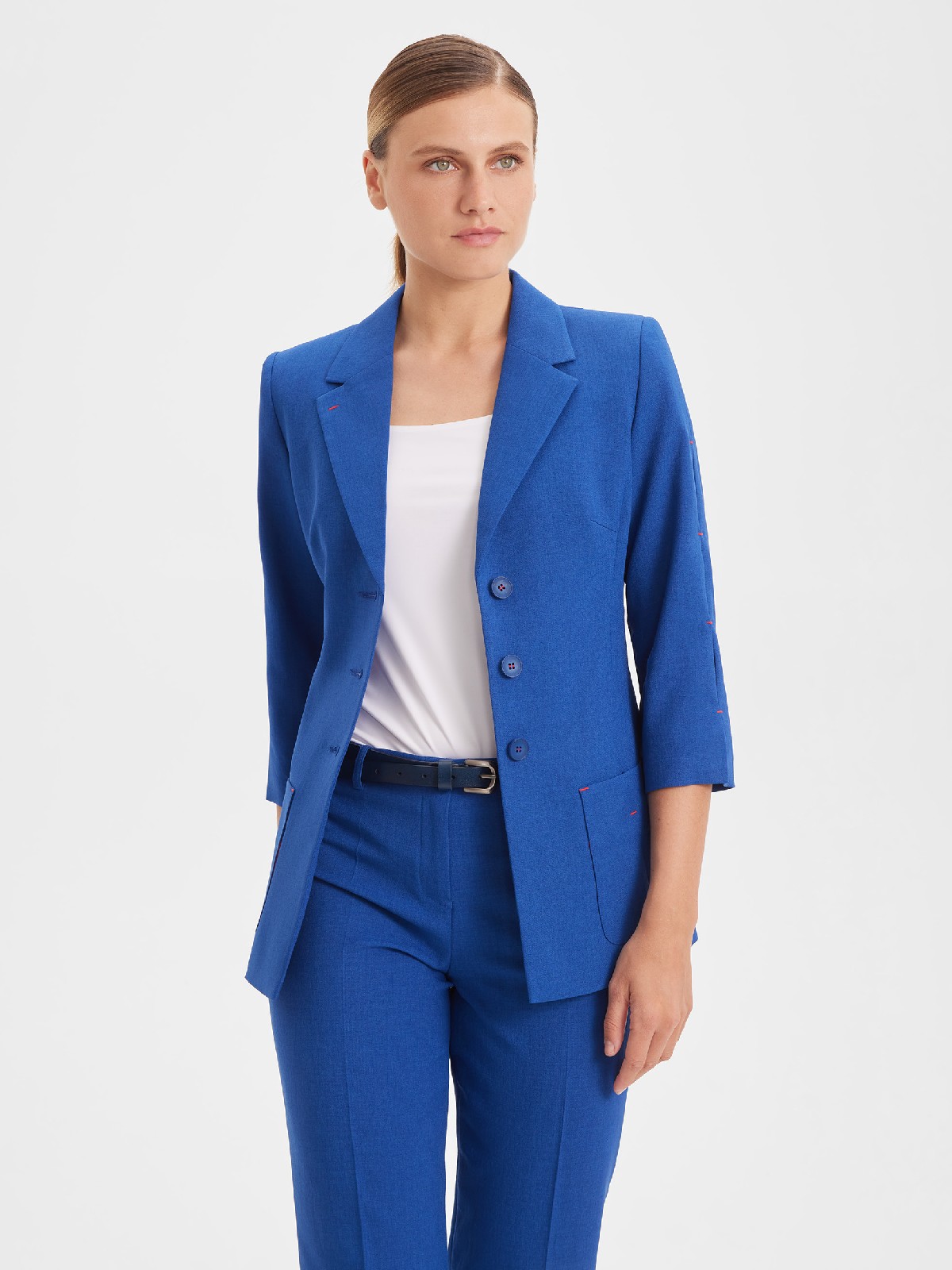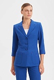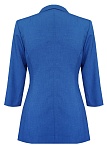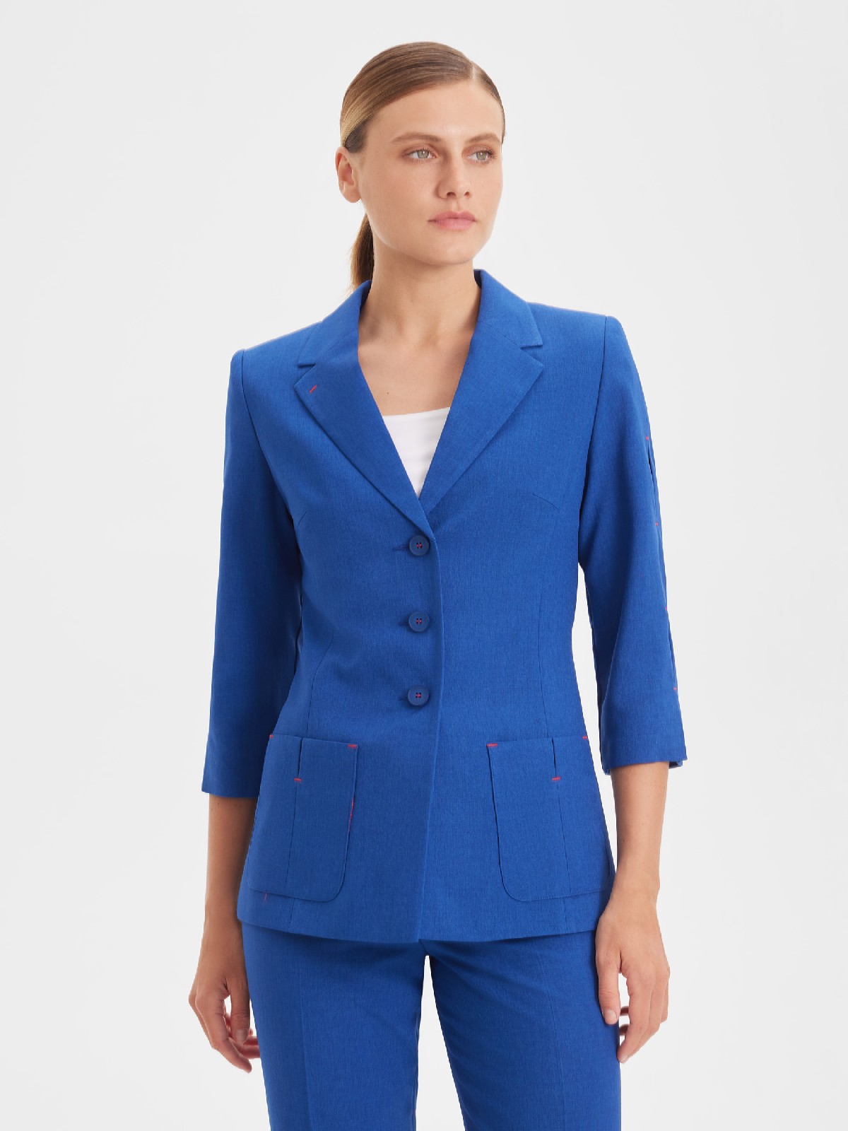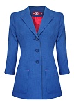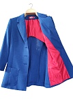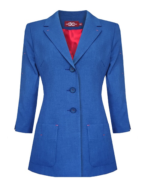 Легкий жакет синего цвета из смесовой ткани вишер льняной структуры с ярко-красной подкладкой только по полочке, средняя длина, приталенный, однобортный, английский воротник, накладные карманы со складкой, прямой борт, застежка на пуговицы, рукава длиной 3/4 с разрезами по центральному шву, на рукавах и карманах ярко-красные закрепки, модель с тонкими подплечниками, 1/2 подкладки. Ткань лен-вишер сохраняет свою натуральность, меньше мнется, ее легче гладить, в отличие от чистольняной ткани.