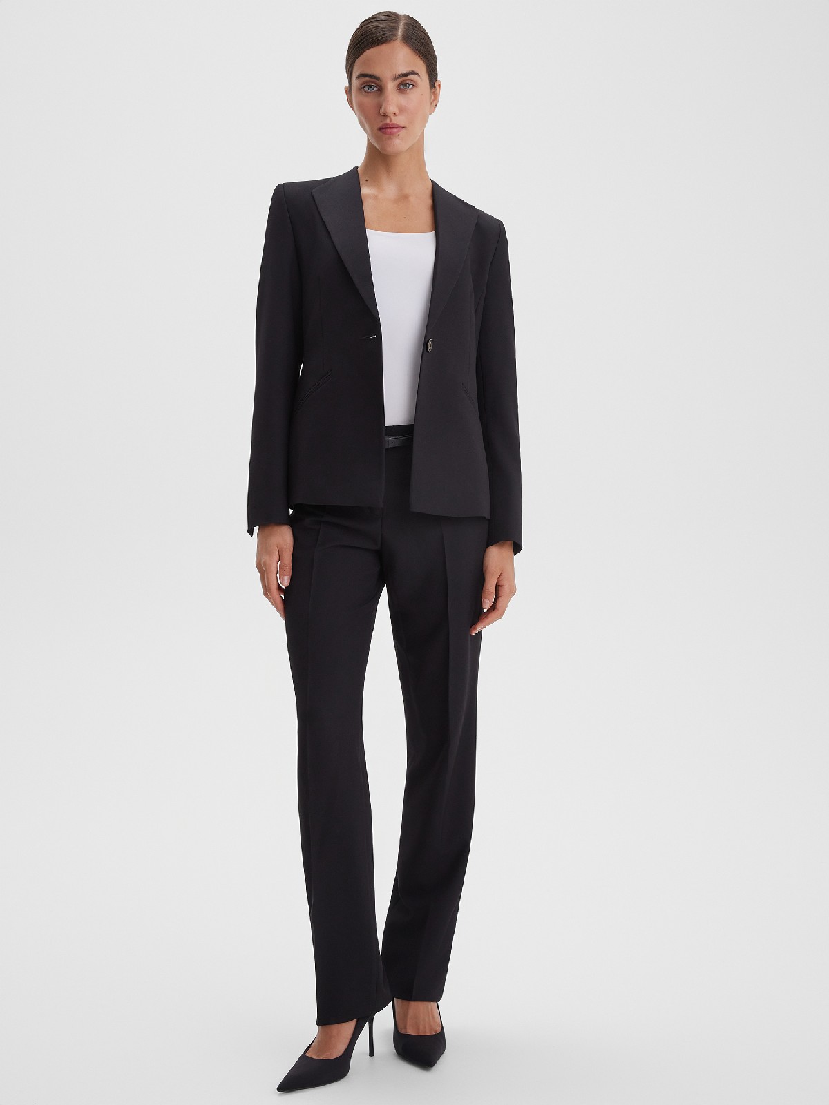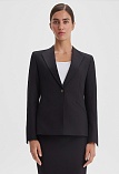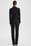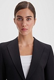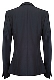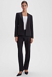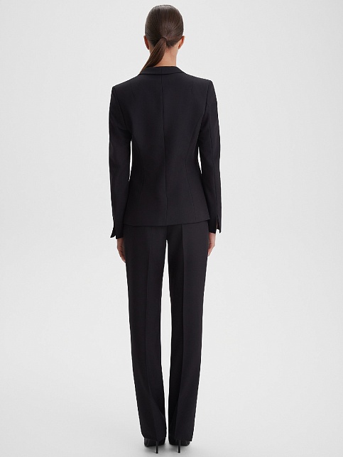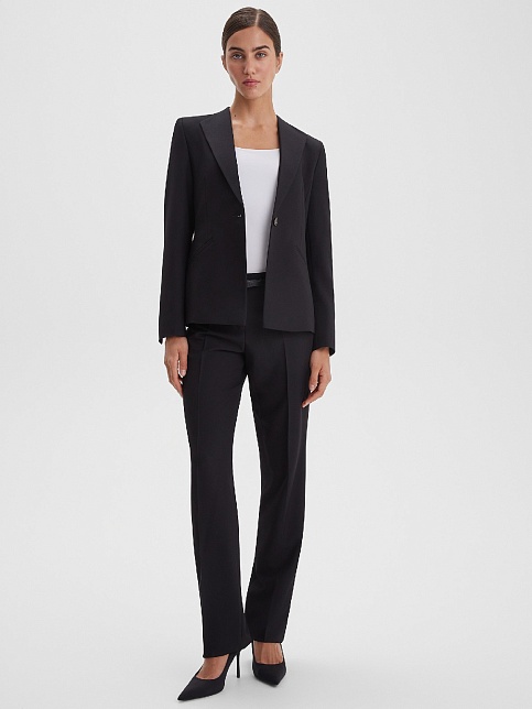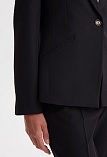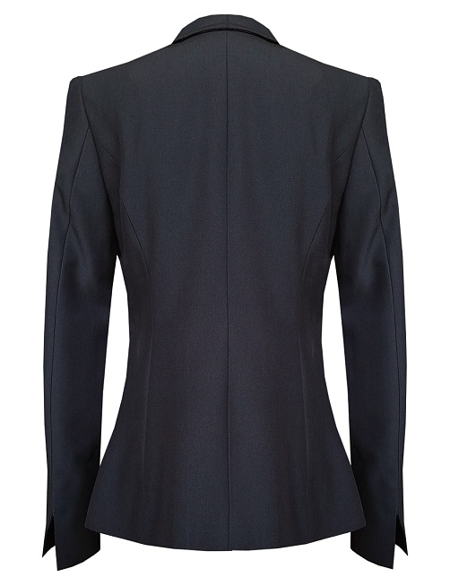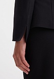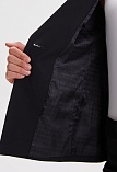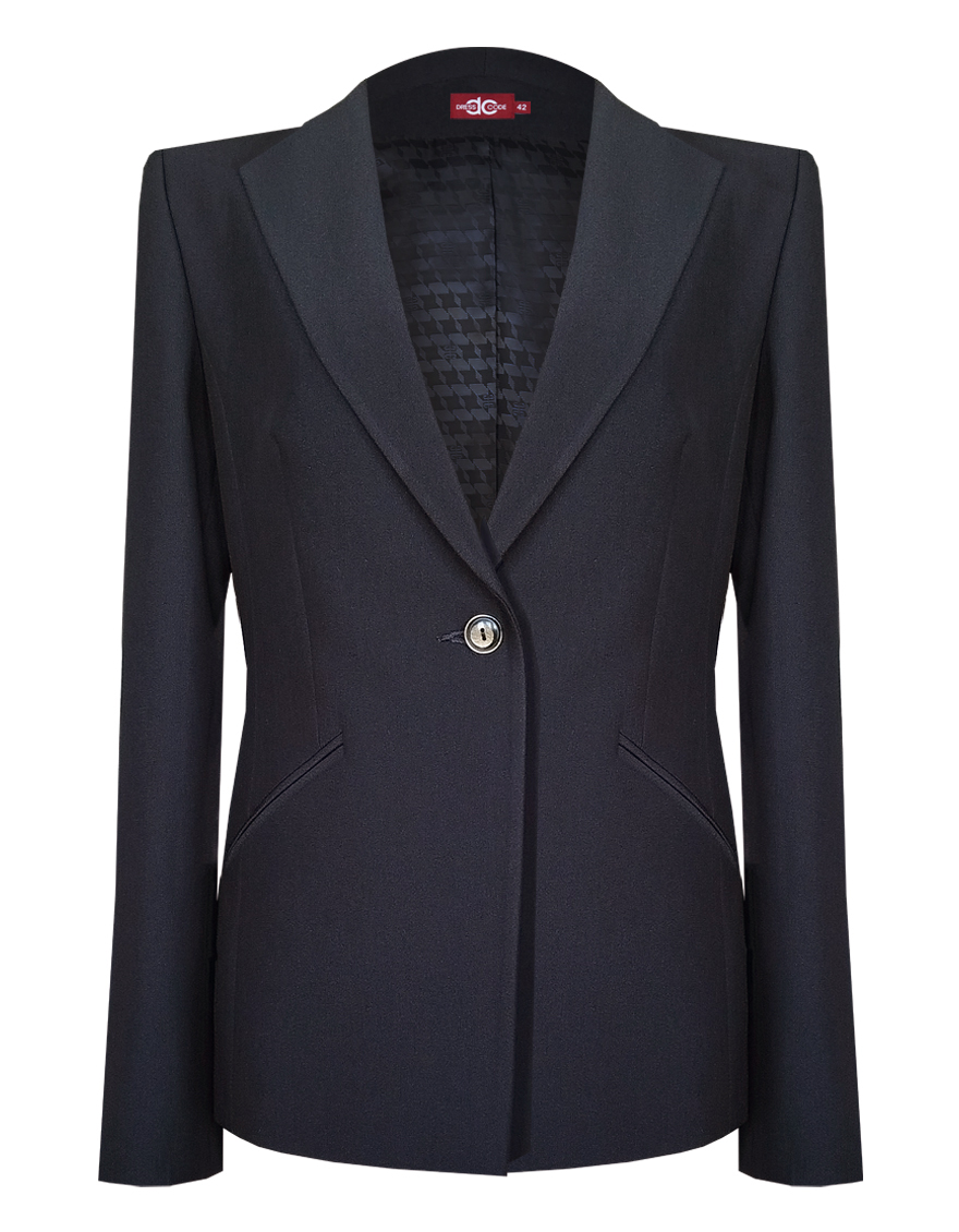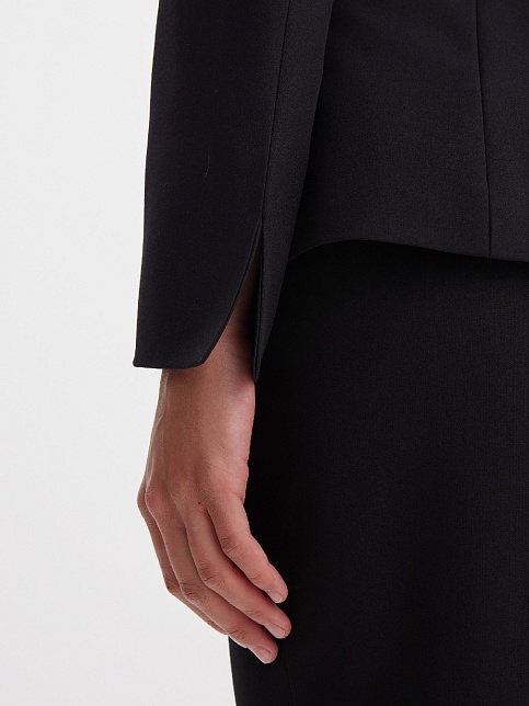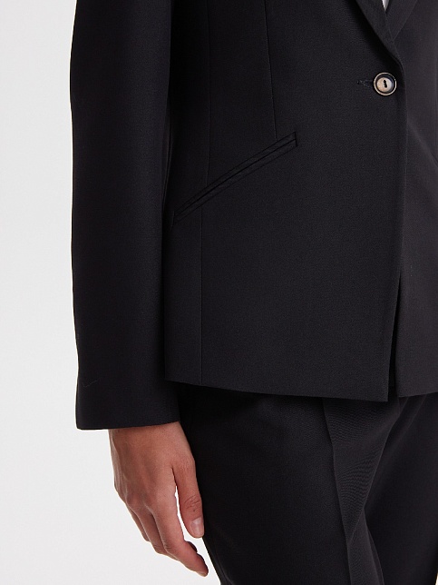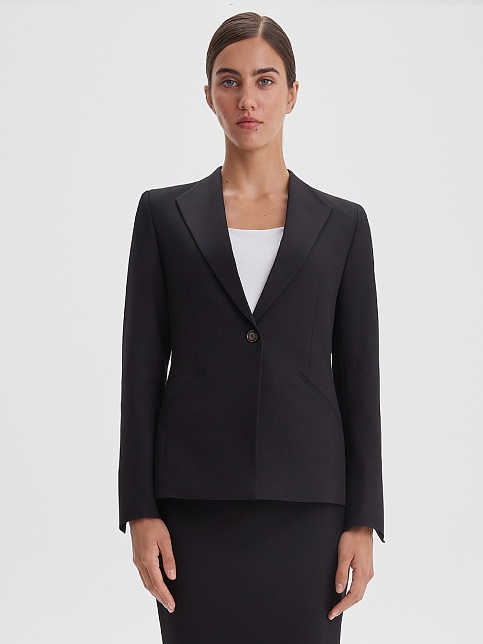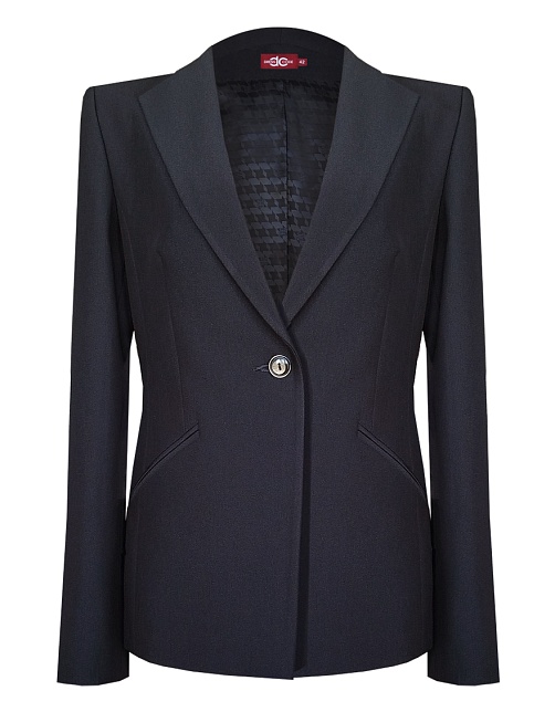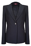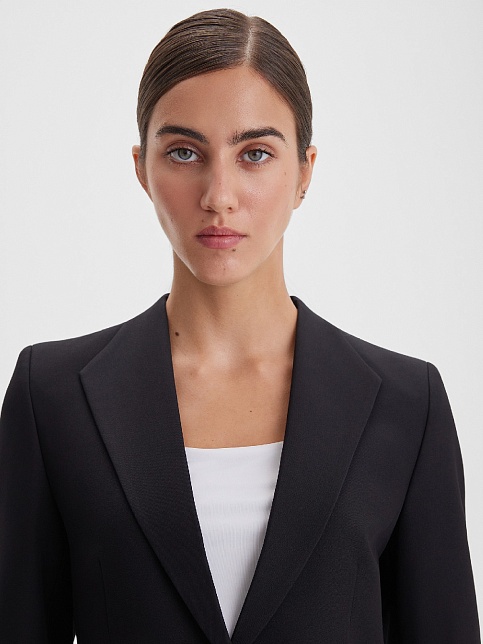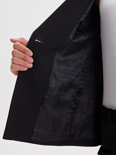 Черный жакет из поливискозной ткани средней длины, приталенный, однобортный, воротник "апаш" - разновидность воротника типа шалевого, прорезные карманы в рамку, прямой борт, застежка на одну пуговицу, длинный втачной рукав с разрезом, который легко позволяет менять длину рукава, тонкие подплечники, на подкладке черного цвета. Поливискозная ткань - смесовая ткань, в состав которой входят волокна вискозы и полиэстера. Именно полиэстер придает ткани прочность, долговечность и опрятный внешний вид.