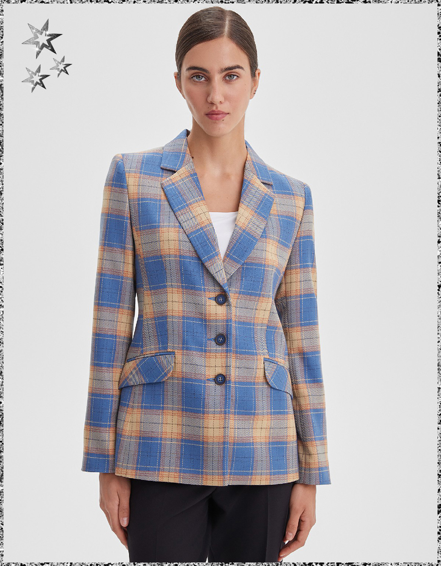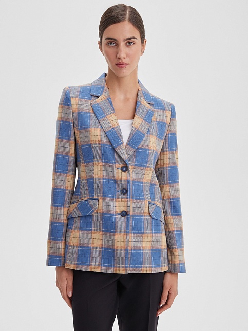 Роскошный жакет в клетку в ярком и контрастном цветовом сочетании привлекает внимание, создавая образ уверенности и силы, слегка удлиненный, приталенный, однобортный, английский воротник, прорезные карманы с клапаном, прямой борт, застежка на пуговицы, длинный втачной рукав, тонкие подплечники, модель на подкладке, с 54 размера модель более удлиненная и на спинке добавили шлицу. Комфортная посадка на любой размер. Модель выполнена из премиальной смесовой ткани.