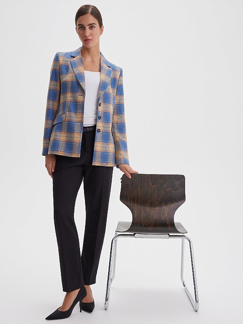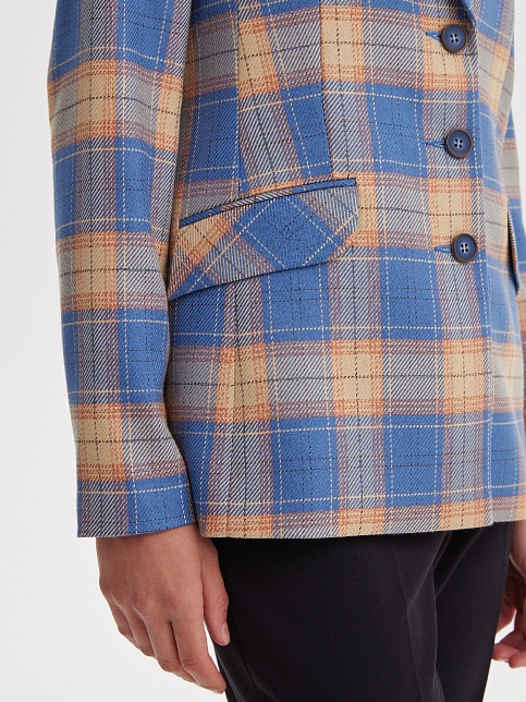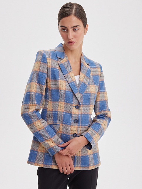 Роскошный жакет в клетку в ярком и контрасном цветовом сочетании привлекает внимание, создавая образ уверенности и силы, слегка удлиненный, приталенный, однобортный, английский воротник, прорезные карманы с клапаном, прямой борт, застежка на пуговицы, длинный втачной рукав, тонкие подплечники, модель на подкладке, с 54 размера модель более удлиненная и на спинке добавили шлицу. Комфортная посадка на любой размер. Модель выполнена из премиальной смесовой ткани.