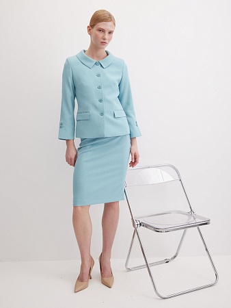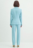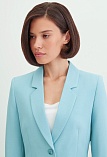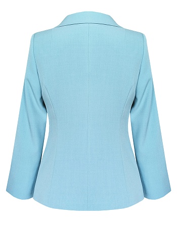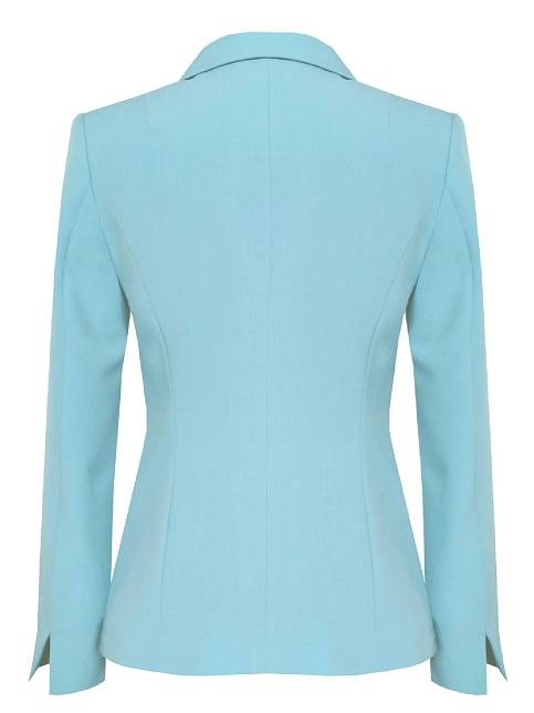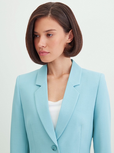 Жакет из поливискозной ткани в пастельно-бирюзовом цвете выглядит нежно и освежающе, средняя длина, приталенный, однобортный, английский воротник, прорезные карманы в рамку выполнены под наклоном, прямой борт, застежка на пуговицы, длинный втачной рукав с разрезом, который можно отвернуть, тем самым укоротив его длину, тонкие подплечники, модель на подкладке. Поливискозная ткань - это смесовая ткань, в состав которой входят волокна вискозы и полиэстера. Ткань практически не подвержена истиранию