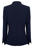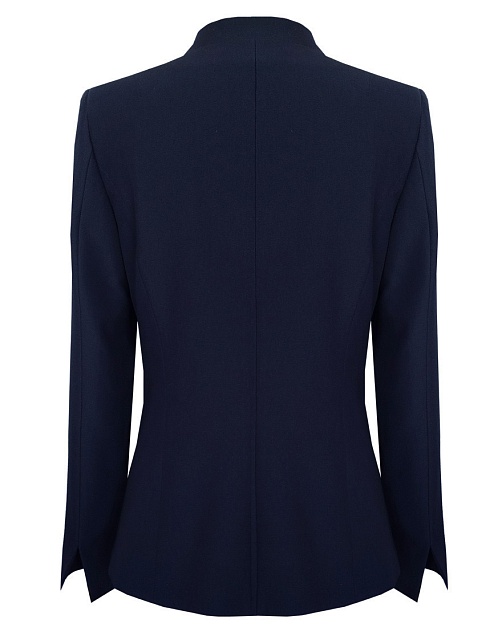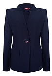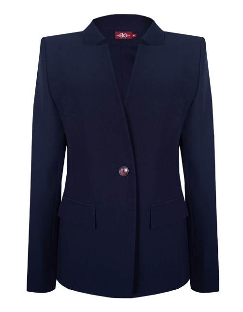 Жакет темно-синего цвета из поливискозной ткани, средняя длина, приталенный, однобортный, на спинке и полочке фигурные рельефы, воротник стойка, прорезные карманы с клапаном, застежка на одну пуговицу, длинный втачной рукав с разрезом, который позволяет менять длину рукава, тонкие подплечники, модель на жаккардовой подкладке синего цвета с рельефным выразительным узором. Поливискозная ткань - смесовая ткань, в состав которой входят волокна вискозы и полиэстера.