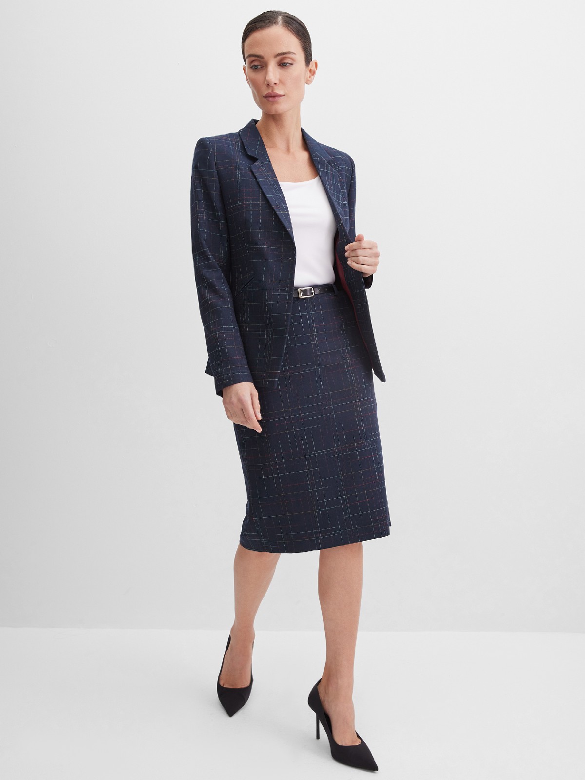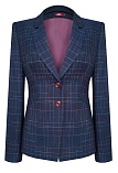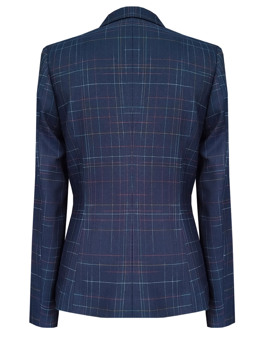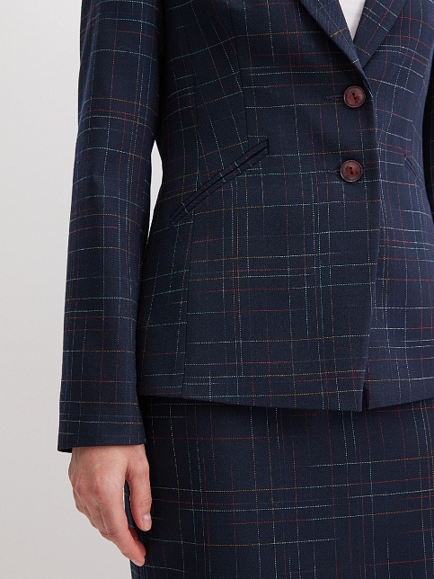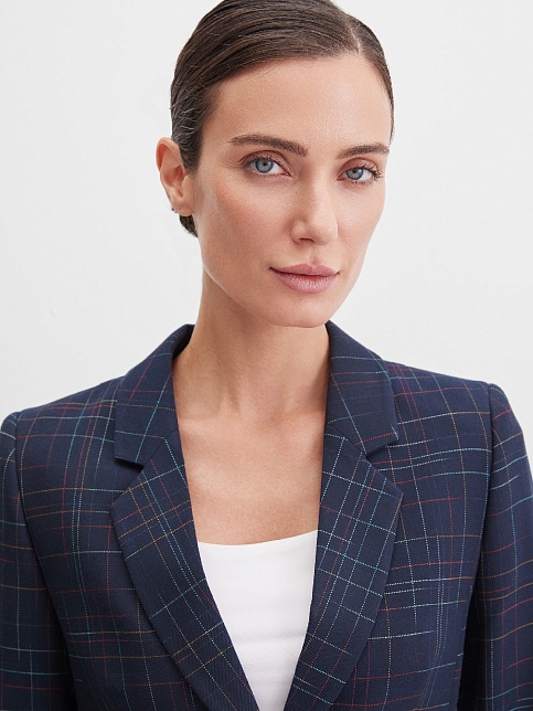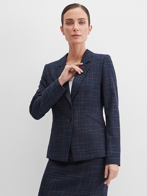 Классический жакет темно-синего цвета из поливискозной ткани в тонкую, почти незаметную разноцветную клетку, средняя длина, приталенный, однобортный, английский воротник, прорезные карманы в рамку выполнены под наклоном, прямой борт, застежка на пуговицы, длинный втачной рукав, тонкие подплечники, модель на подкладке. Благодаря увеличенным прибавкам на свободу облегания и их гармоничному распределению, модель подходит для всех типов фигур, идеальная посадка рукава для полных рук.
