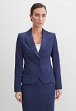 Слегка укороченный жакет в красивом синем цвете из мягкой и пластичной вельветовой ткани в мелкий  рубчик, по своей структуре напоминающий бархат, приталенный, однобортный, английский воротник с широким лацканом, прорезные карманы с клапаном, круглый борт, застежка на пуговицы, длинный втачной рукав, тонкие подплечники, модель на подкладке. Гармоничное распределение прибавок на свободу облегания обеспечивают больше комфорта и удобства в носке.