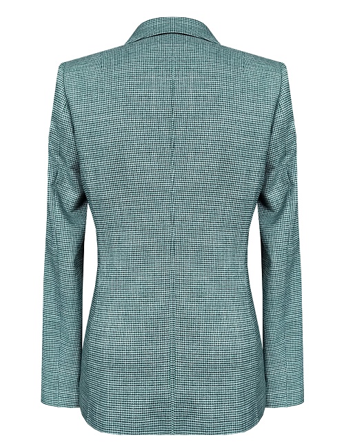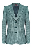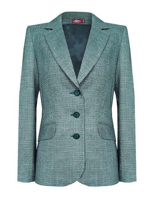 Классический жакет из поливискозной ткани в благородной цветовой гамме из гармонично сочетающихся зеленоватых оттенков с мелким рисунком ломаной клетки "пье-де-пуль", который стал синонимом классического и утонченного стиля, средняя длина, приталенный, однобортный, английский воротник, прорезные карманы с клапаном, круглый борт, общий подкройной бочок у спинки и полочки, застежка на пуговицы, длинный втачной рукав, тонкие подплечники, модель на подкладке. Комфортная посадка на любой размер.