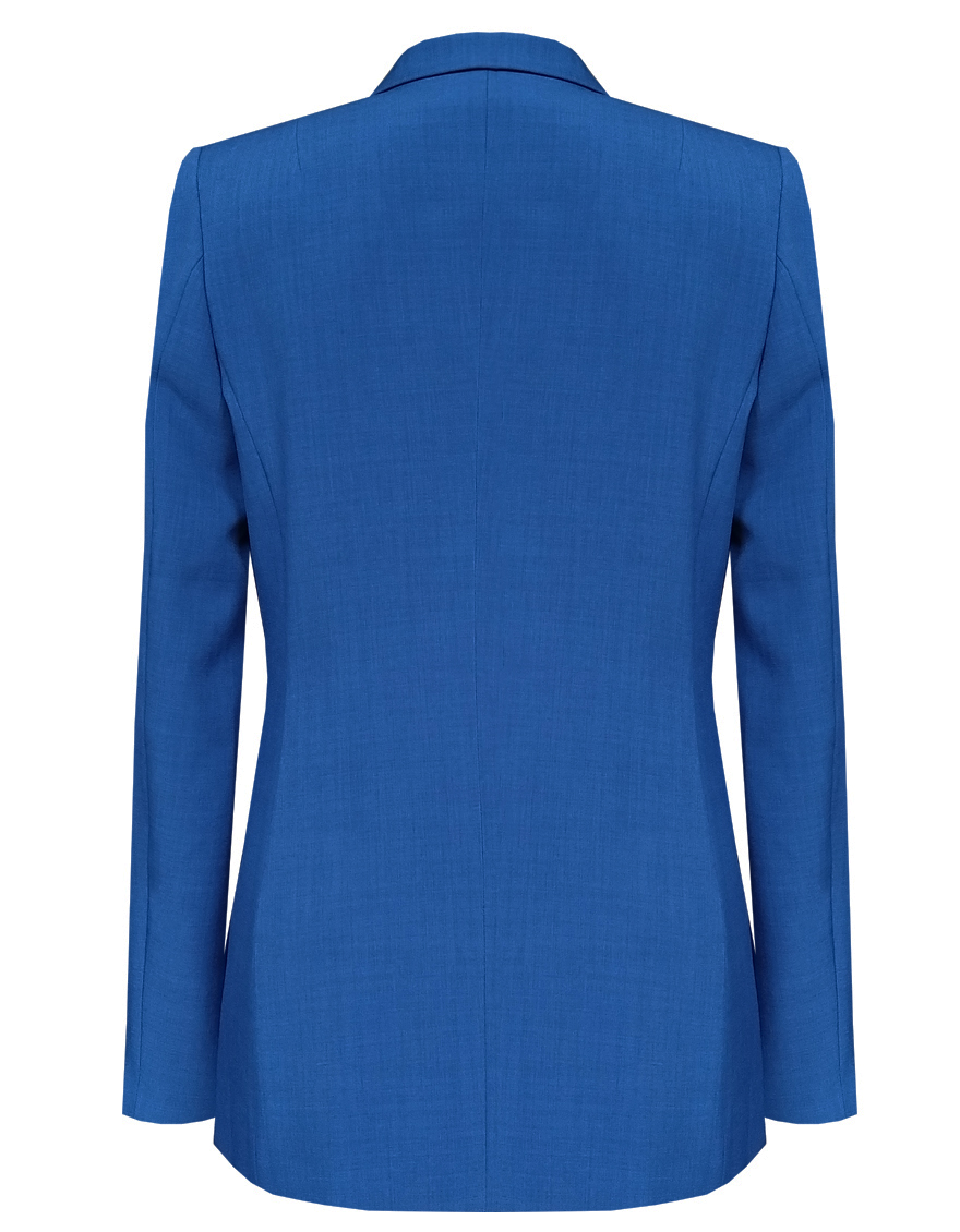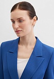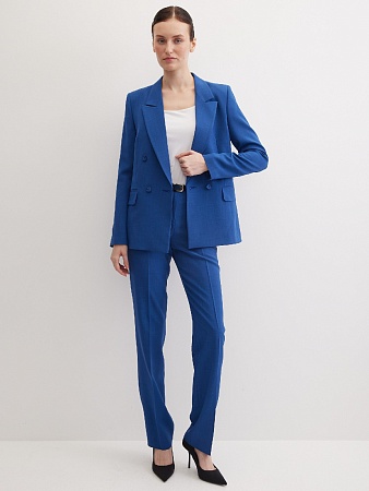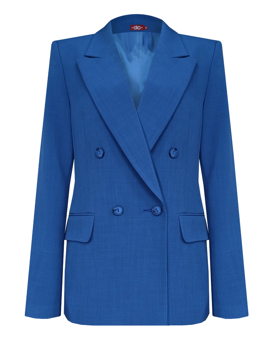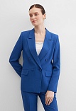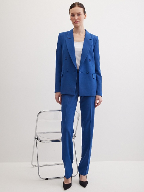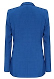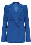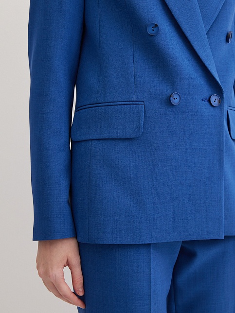 Двубортный жакет из поливискозной ткани в насыщенно синем цвете, слегка удлиненный, умеренный объем за счет легкого приталивания, английский воротник, прорезные карманы с клапаном, прямой борт, застежка на пуговицы, длинный втачной рукав, удобная комфортная посадка за счет общего подкройного бочка у спинки и полки, тонкие подплечники, модель на подкладке. Поливискозная ткань - это смесовая ткань, в состав которой входят волокна вискозы и полиэстера. Ткань практически не подвержена истиранию.