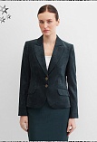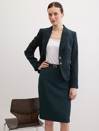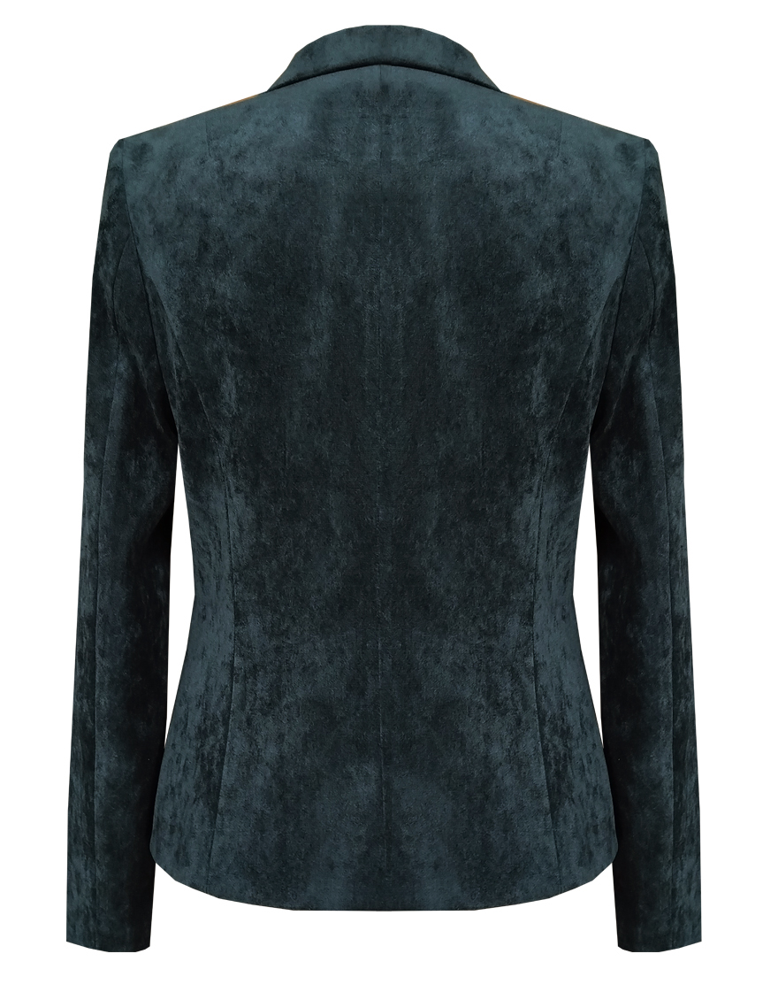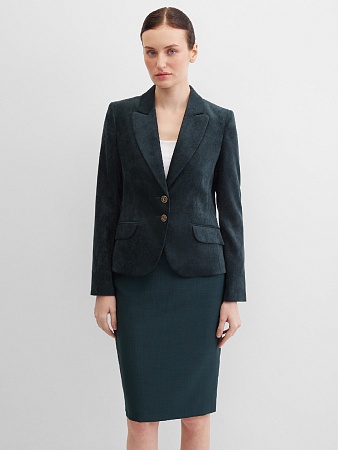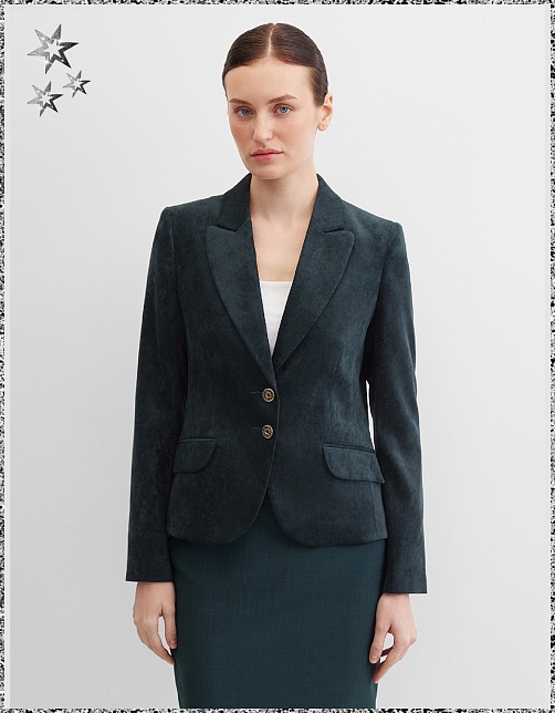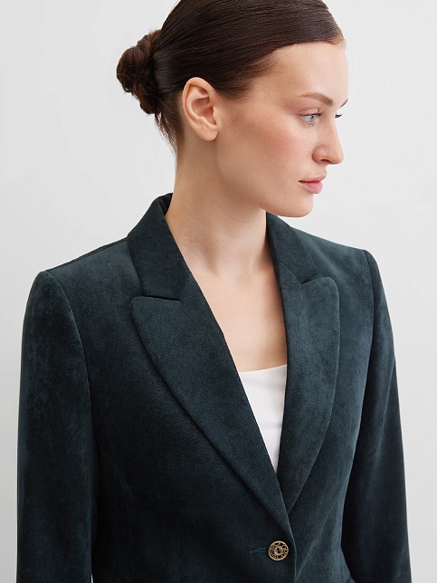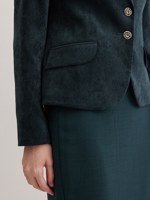 Слегка укороченный жакет в изысканном зеленом цвете из мягкой и пластичной велюровой ткани, по своей структуре напоминающий бархат, имеет характерный блеск и мягкие переливы, приталенный, однобортный, английский воротник с широким лацканом, прорезные карманы с клапаном, круглый борт, застежка на пуговицы, длинный втачной рукав, тонкие подплечники, модель на подкладке. Гармоничное распределение прибавок на свободу облегания обеспечивают больше комфорта и удобства в носке.
