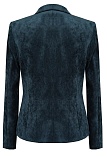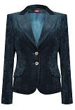 Слегка укороченный жакет в изысканном зеленом цвете из мягкой и пластичной вельветовой ткани в мелкий  рубчик, по своей структуре напоминающий бархат, приталенный, однобортный, английский воротник с широким лацканом, прорезные карманы с клапаном, круглый борт, застежка на пуговицы, длинный втачной рукав, тонкие подплечники, модель на подкладке. Гармоничное распределение прибавок на свободу облегания обеспечивают больше комфорта и удобства в носке.