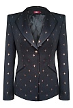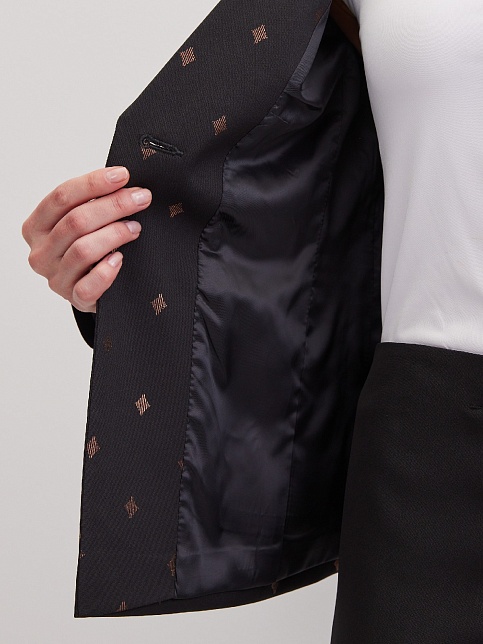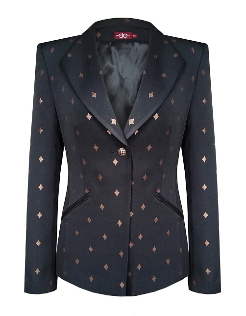 Роскошный черный жакет с золотистым ромбовидным узором из поливискозной ткани, средняя длина, приталенный, однобортный, оригинальный воротник "апаш" - разновидность воротника типа шалевого, прорезные карманы в рамку, прямой борт, застежка на одну пуговицу, длинный втачной рукав, тонкие подплечники, на подкладке черного цвета. Поливискозная ткань - смесовая ткань, в состав которой входят волокна вискозы и полиэстера. Строгий праздничный пиджак для торжественного дресс-кода!