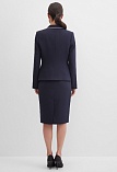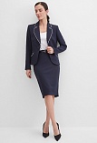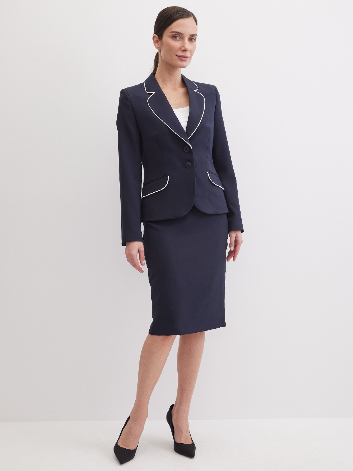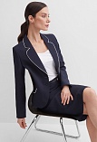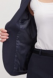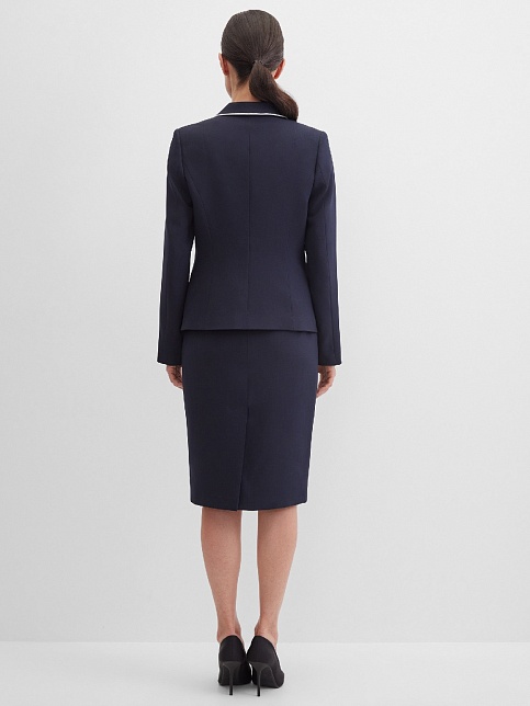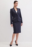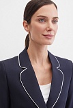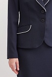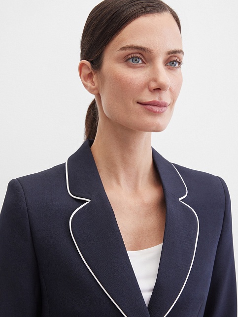 Слегка укороченный  жакет из смесовой ткани в благородном синем цвете с изящной отделкой из узкого белого канта по краю кармана и воротника, что придает изделию аккуратный и законченный вид, приталенный, однобортный, английский воротник, прорезные карманы с клапаном, круглый борт,  застежка на пуговицы, длинный втачной рукав, тонкие подплечники, модель полностью на подкладке.