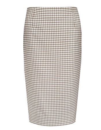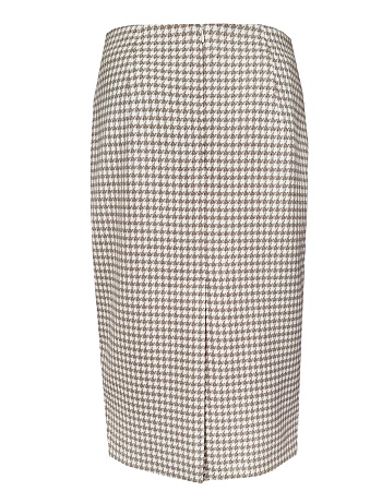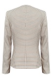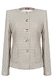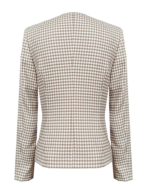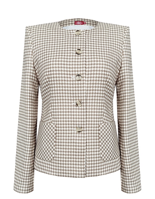 Жакет с двухцветным геометрическим орнаментом пье де пуль ("гусиная лапка") в бежевом оттенке из поливискозной ткани, средняя длина, приталенный, однобортный, круглая горловина без воротника, небольшие накладные карманы, прямой борт, застежка на пуговицы, длинный втачной рукав, тонкие подплечники, модель на подкладке. Поливискозная ткань - смесовая ткань, в состав которой входят волокна вискозы и полиэстера. Именно полиэстер придает ткани прочность, долговечность и опрятный внешний вид.
