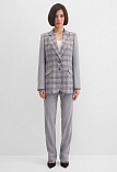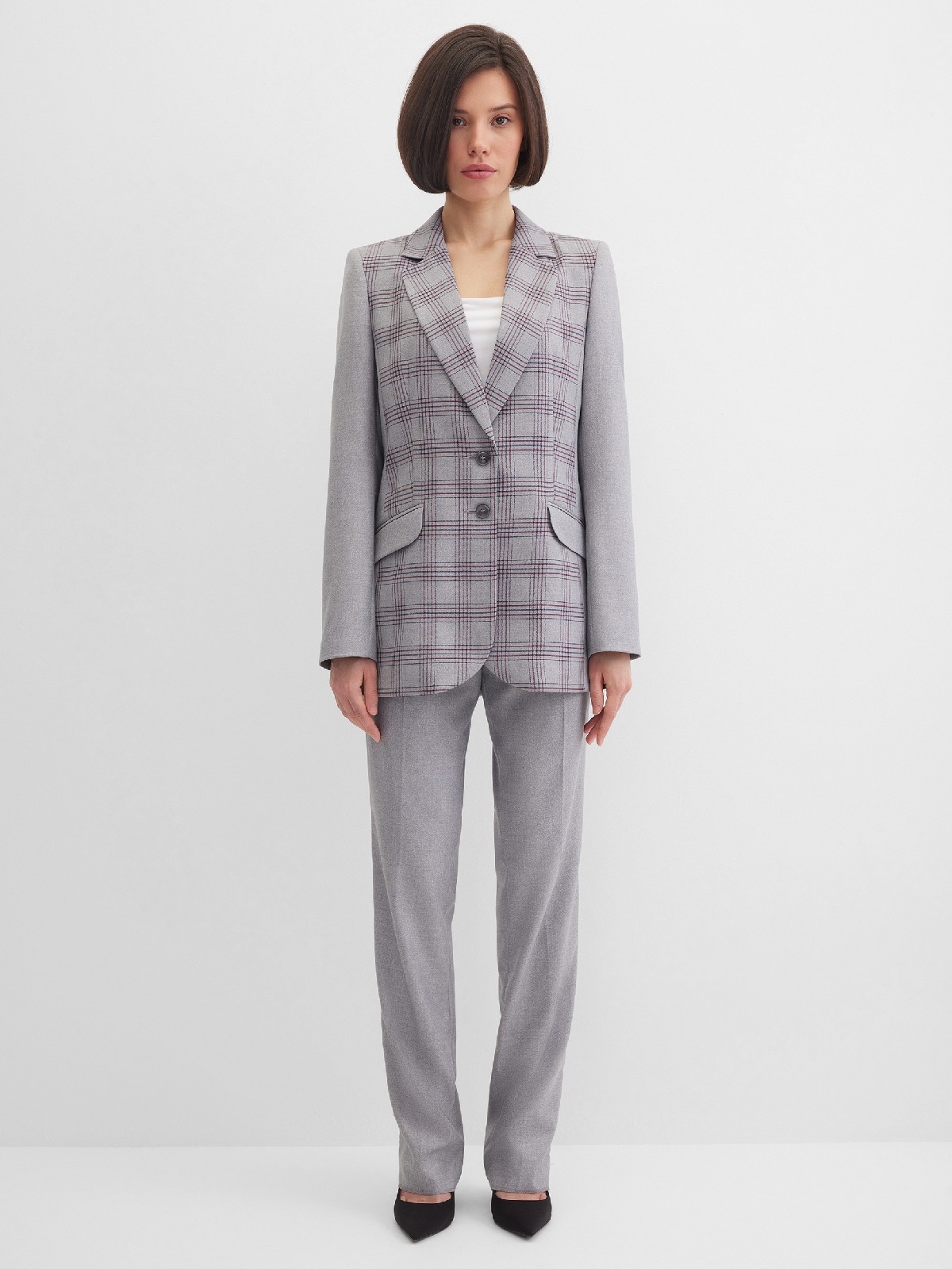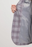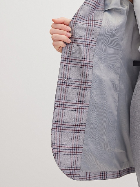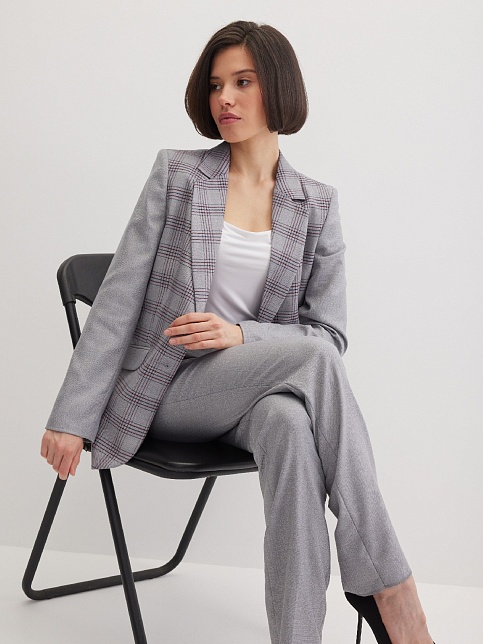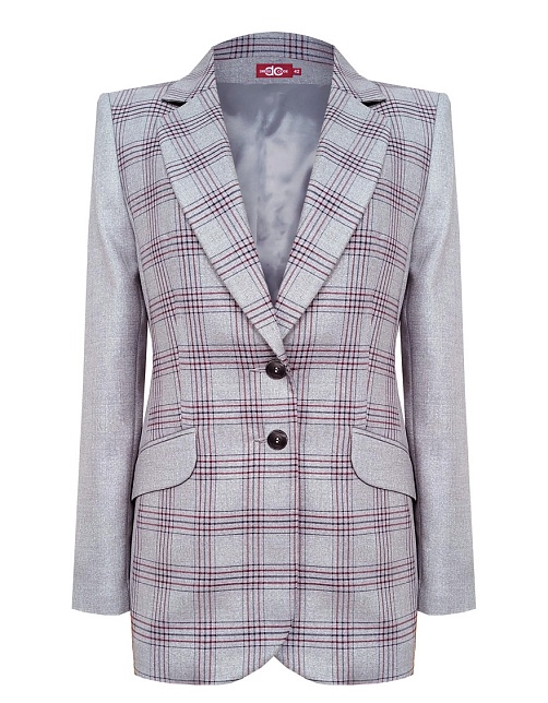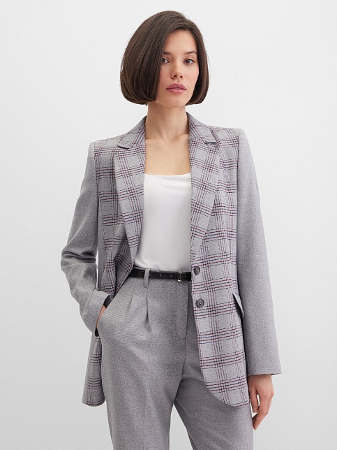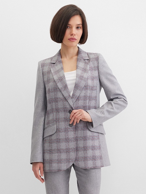 Классический жакет из поливискозной ткани серого цвета с акцентом на полочку, которая выполнена из ткани компаньона в клетку с актуальным сочетанием цветов, комфортная длина прикрывающая бедра, приталенный, однобортный, английский воротник, прорезные карманы с клапаном, круглый борт, застежка на пуговицы, сзади шлица, длинный втачной рукав, тонкие подплечники, модель на подкладке. Использование двух видов ткани придает изделию уникальность и позволяет адаптировать модель под разные случаи.