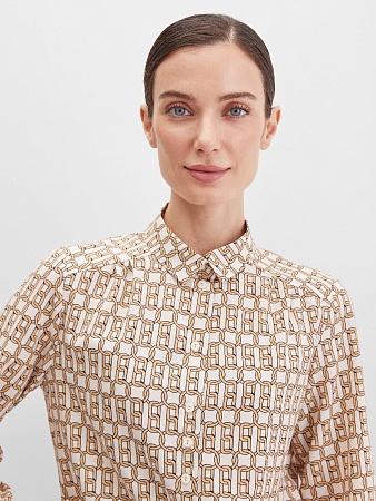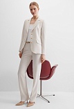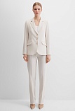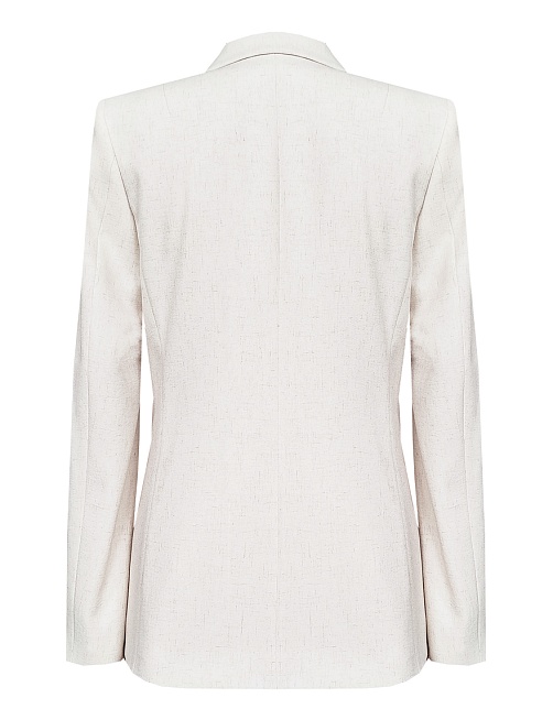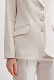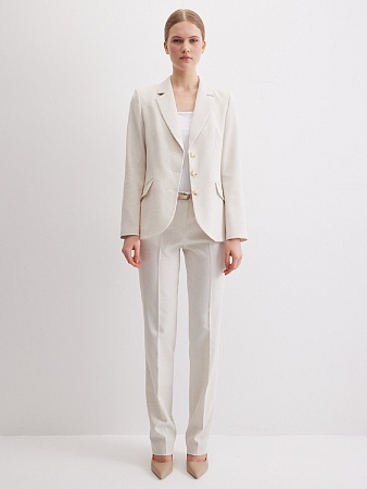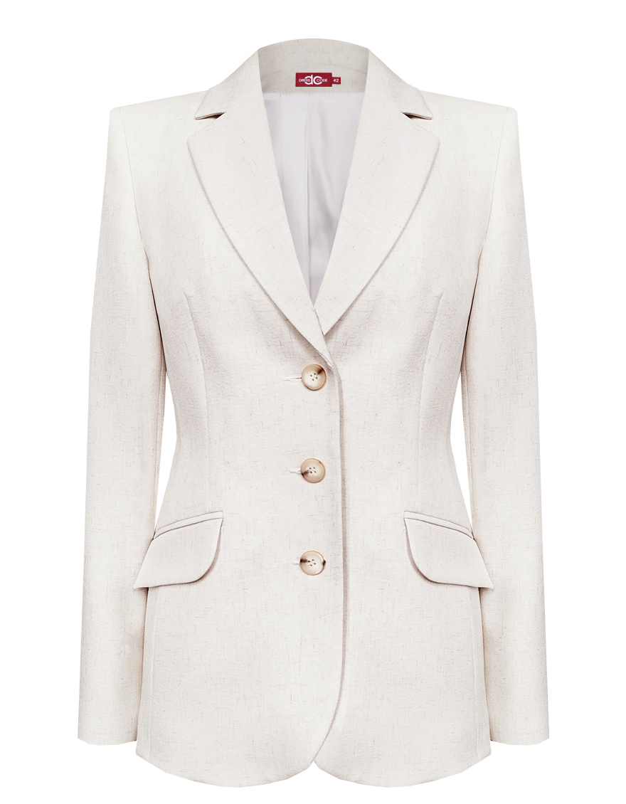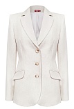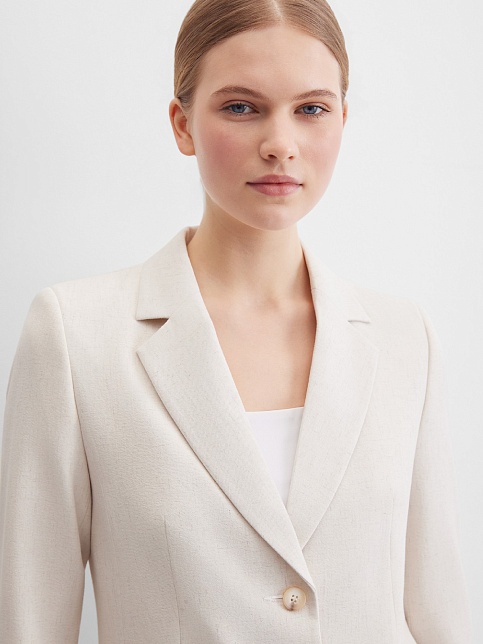 Жакет из поливискозной ткани в мягком жемчужном оттенке с едва заметным переливающимся сиянием перламутрового, создавая кремовое и спокойное настроение, средняя длина, приталенный, однобортный, английский воротник, прорезные карманы с клапаном, круглый борт, застежка на пуговицы, длинный втачной рукав, тонкие подплечники, модель на подкладке. Жакет из такой ткани не так сильно мнется, хорошо держит форму и устойчив к выцветанию, а дышащие свойства поливискозы исключают "парниковый эффект".