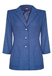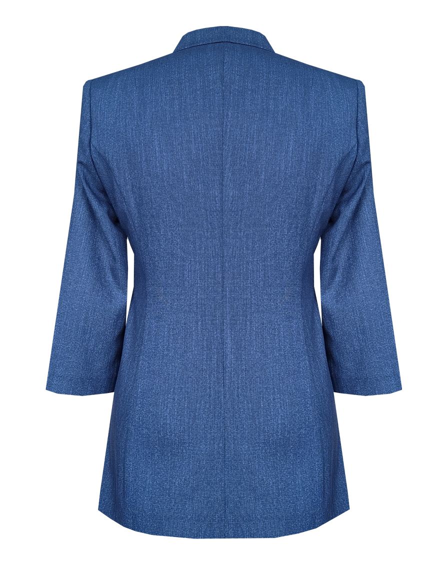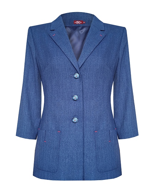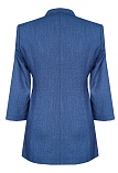 Легкий жакет цвета темно-синего денима из смесовой ткани льняной структуры с полуподкладкой, средняя длина, приталенный, однобортный, английский воротник, накладные карманы со складкой, прямой борт, застежка на пуговицы, втачные рукава 3/4 с разрезами по центральному шву, на рукавах и карманах закрепки, тонкие подплечники. Полуподкладка или половина подкладки в пиджаке, это когда подкладочная ткань закрывает детали полочки, зону плеч и лопаток, а нижняя часть спинки остается без прикрытия.