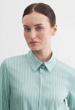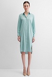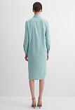 Платье туника или платье блузон из поливискозной ткани в неоново-зеленом цвете в тонкую продольную полоску, представляет из себя нечто среднее между длинной блузкой и платьем миди, свободный крой, отложной воротник, застежка на пуговицы, фигурный низ, втачной рукав 3/4 на узком манжете с функциональной петлей и пуговицей. Это универсальная вешь, которая может быть как самостоятельным нарядом, так и частью ансамбля с брюками или юбкой.