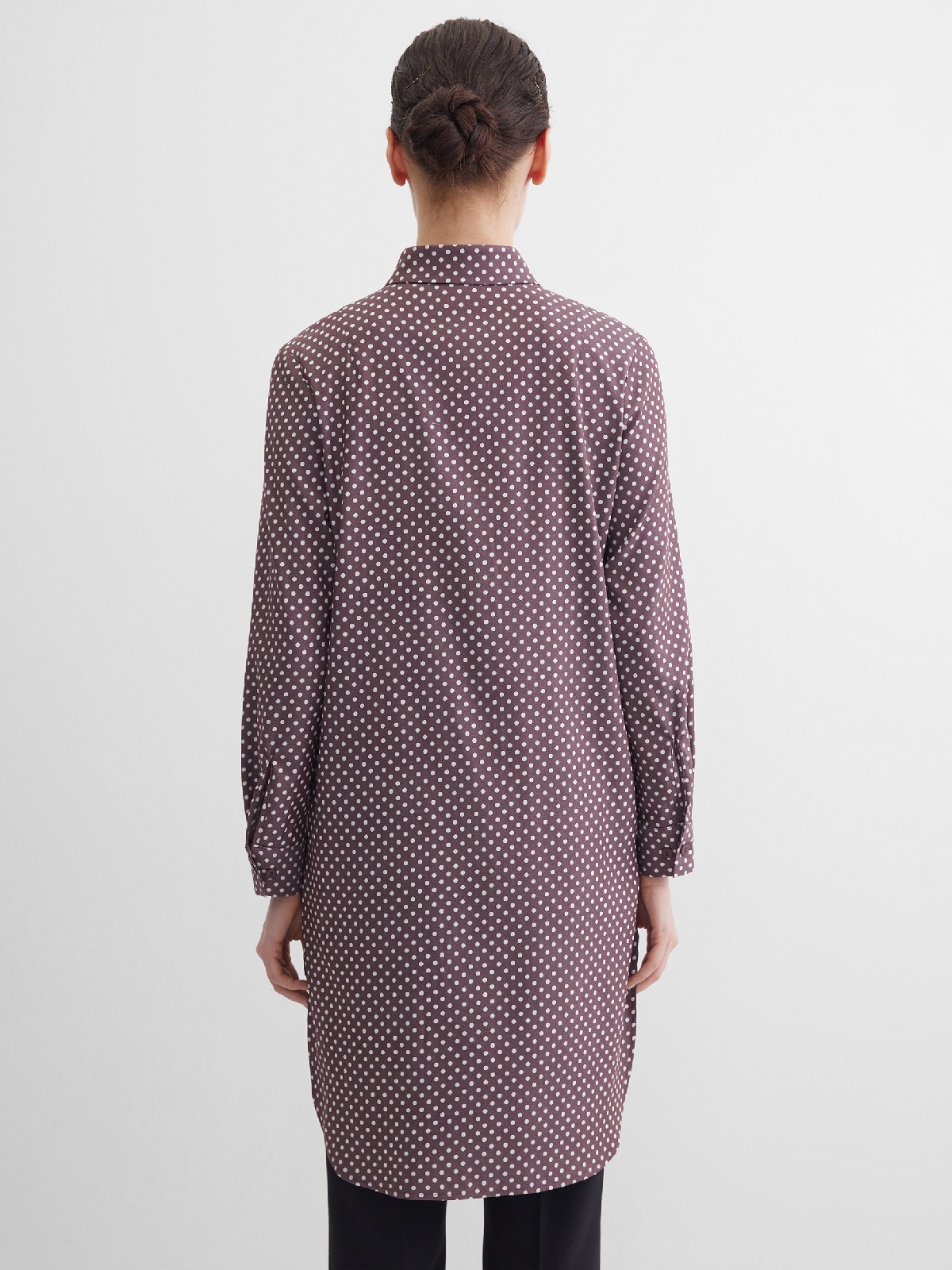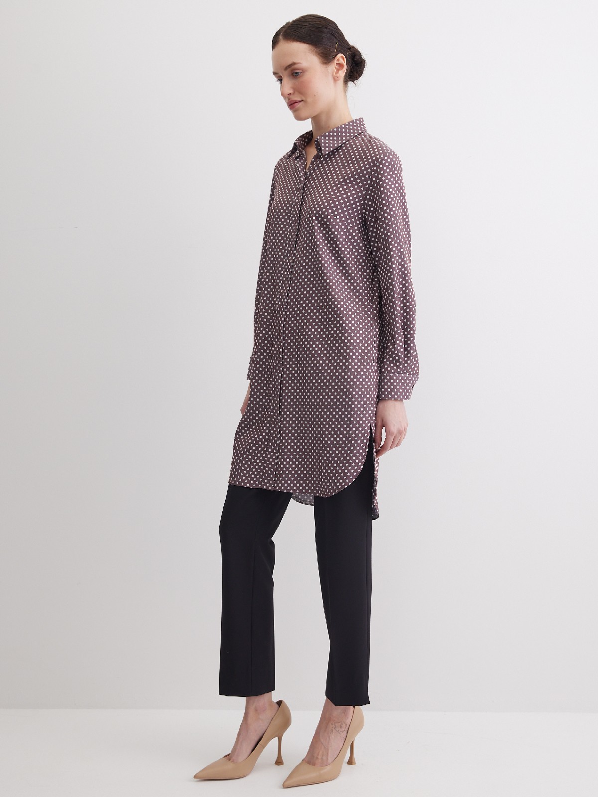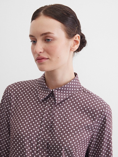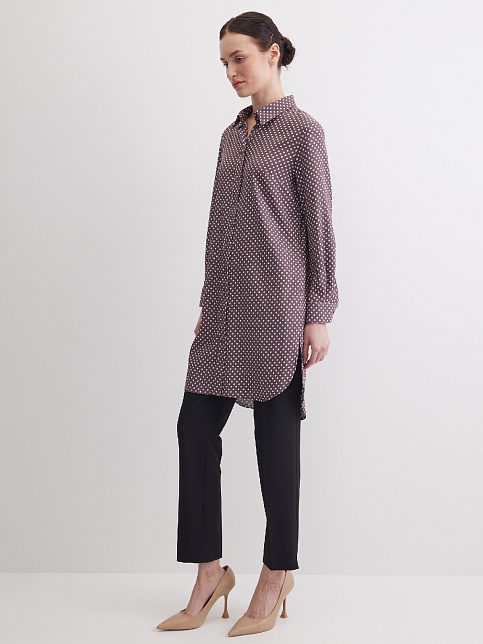 Платье туника или платье блузон из поливискозной ткани с классическим узором "горох", который никогда не выходит из моды и символизирует женственность, модель представляет из себя нечто среднее между длинной блузкой и платьем миди, свободный крой, отложной воротник, застежка на пуговицы, фигурный низ, втачной рукав 3/4 на узком манжете с функциональной петлей и пуговицей. Это универсальная вешь, которая может быть как самостоятельным нарядом, так и частью ансамбля с брюками или юбкой.