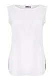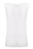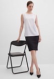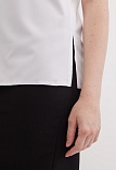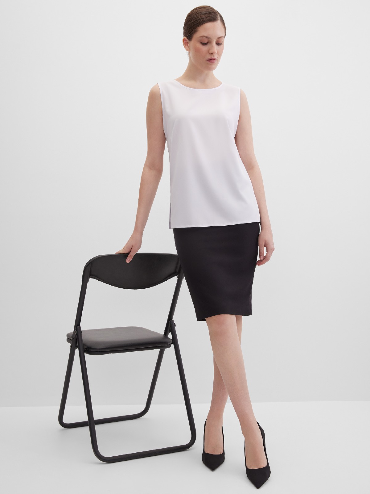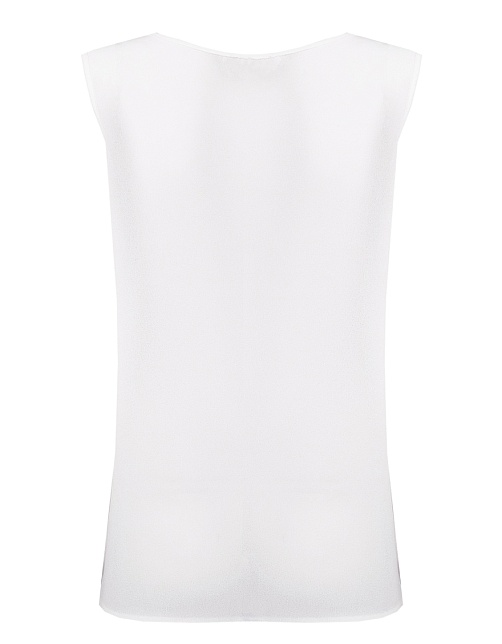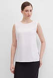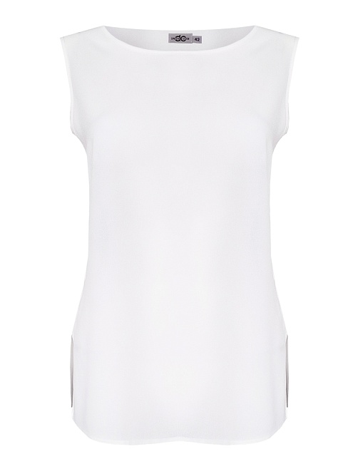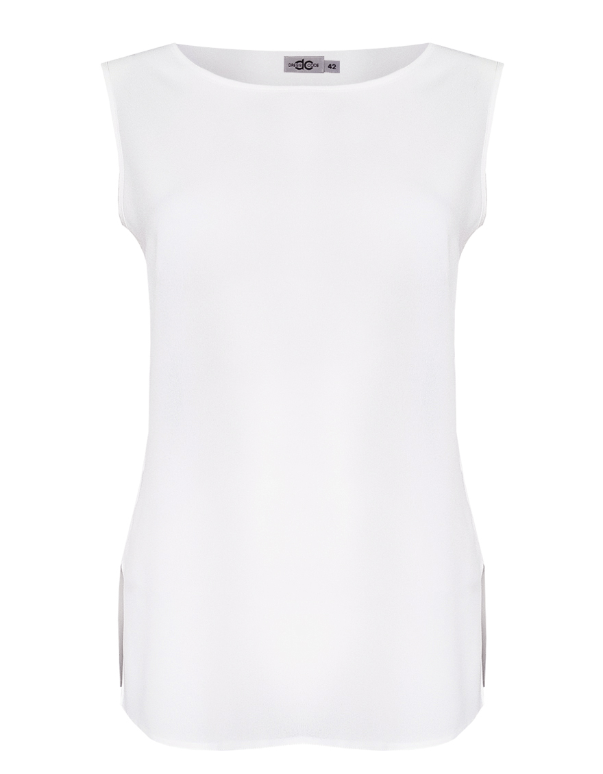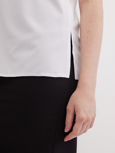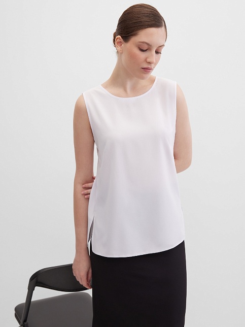 Белоснежный базовый топ из полупрозрачной шифоновой ткани под пиджак или как самостоятельное изделие, приталенный, средняя длина, круглый неглубокий вырез горловины и проймы обработаны узким кантом в цвет основной ткани, по бокам небольшие разрезы для свободы движения и эстетики.