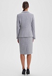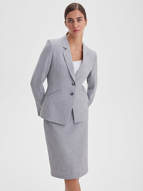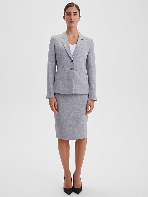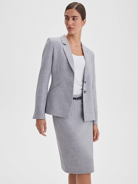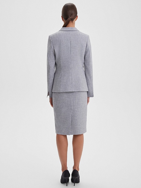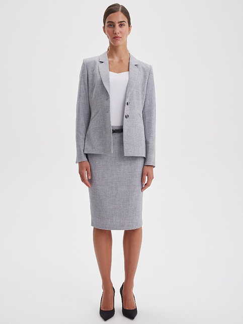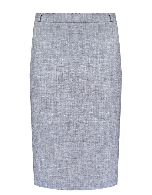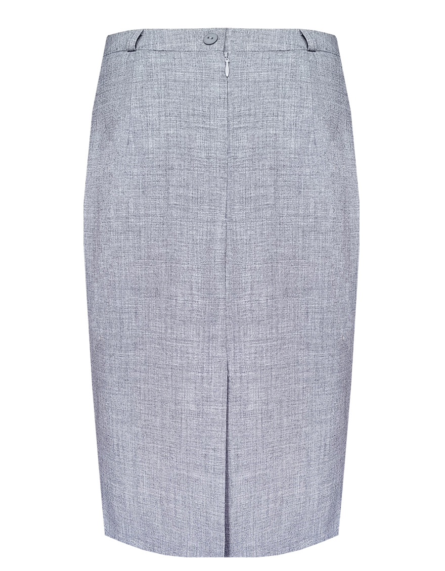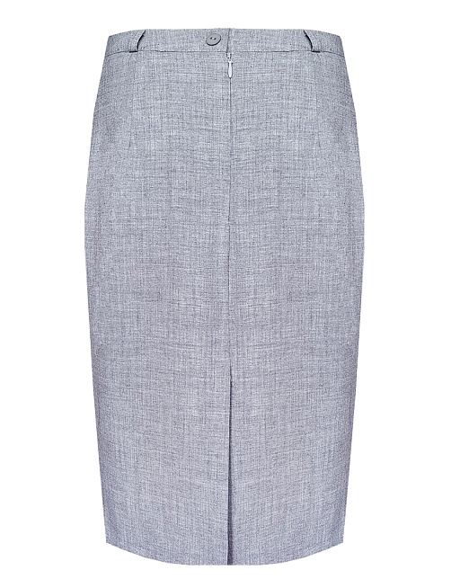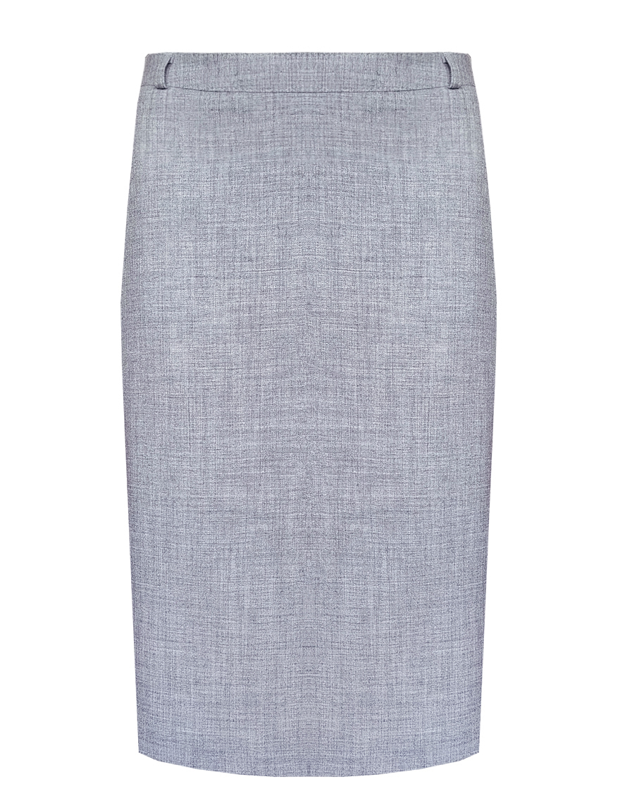 Классическая юбка из поливискозной ткани с легким меланжевым эффектом в перламутровом оттенке серого, слегка зауженная книзу, на поясе со шлевками под ремень, посадка средняя, застежка на молнию и пуговицу в среднем шве спинки, сзади шлица, длина юбки миди - до середины колена, модель на подкладке. Поливискозная ткань - смесовая ткань, в состав которой входят волокна вискозы и полиэстера, именно полиэстер придает ткани прочность, долговечность и опрятный внешний вид.