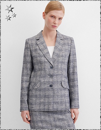Классическая фактурная юбка из поливискозной ткани с неоднородным переплетением сине-белых меланжевых нитей, образуют узор в клетку и придают ткани особый "мраморный" или "переливающийся" эффект, а изделию уникальный внешний вид, слегка зауженная книзу, на поясе со шлевками под ремень, посадка средняя, застежка на молнию и пуговицу в среднем шве спинки, сзади шлица, длина юбки миди - до середины колена, модель на подкладке.