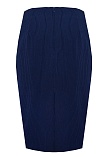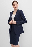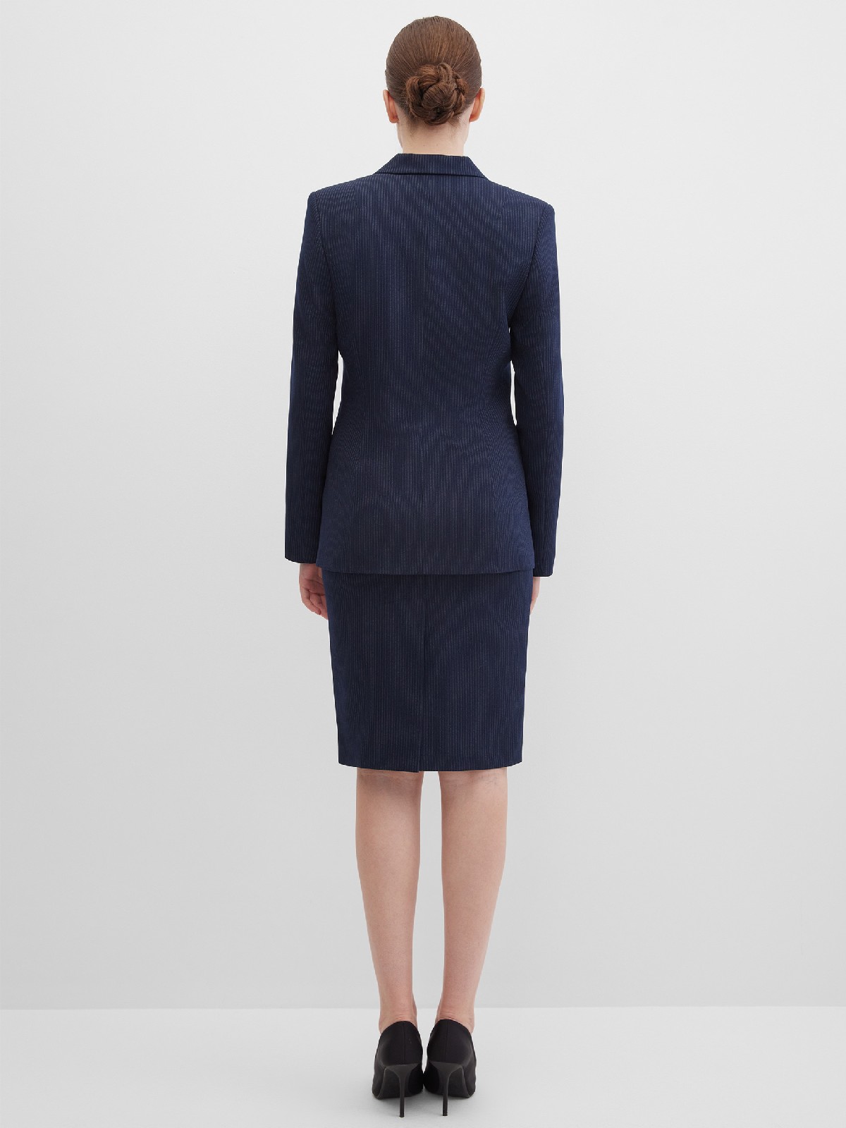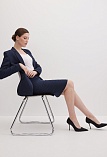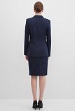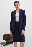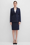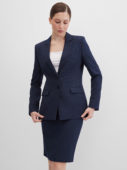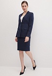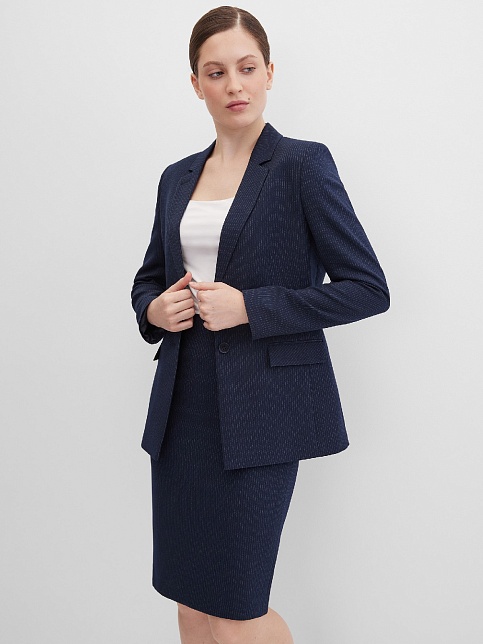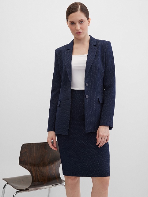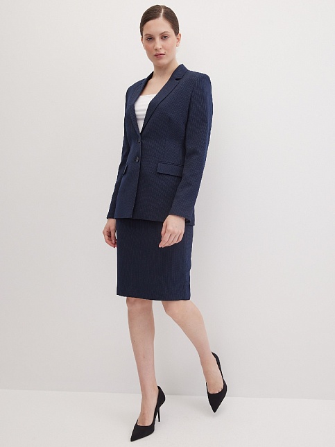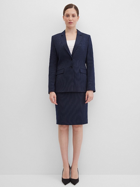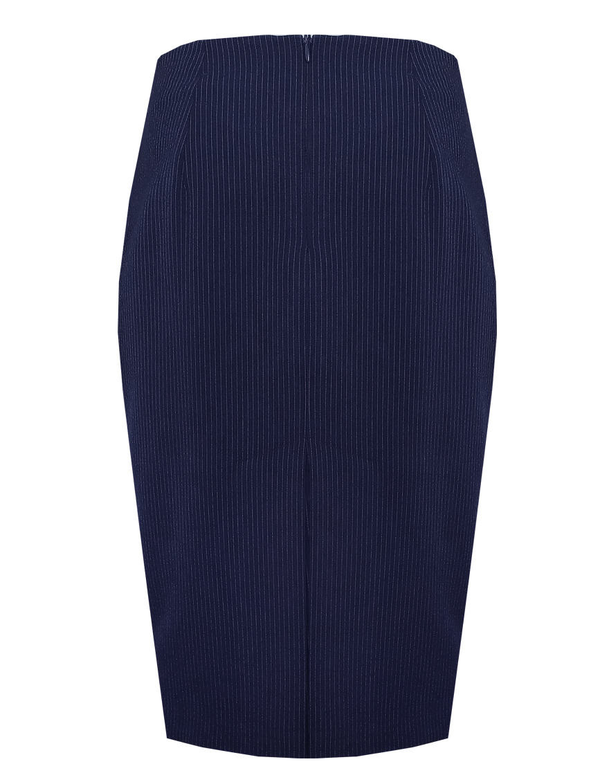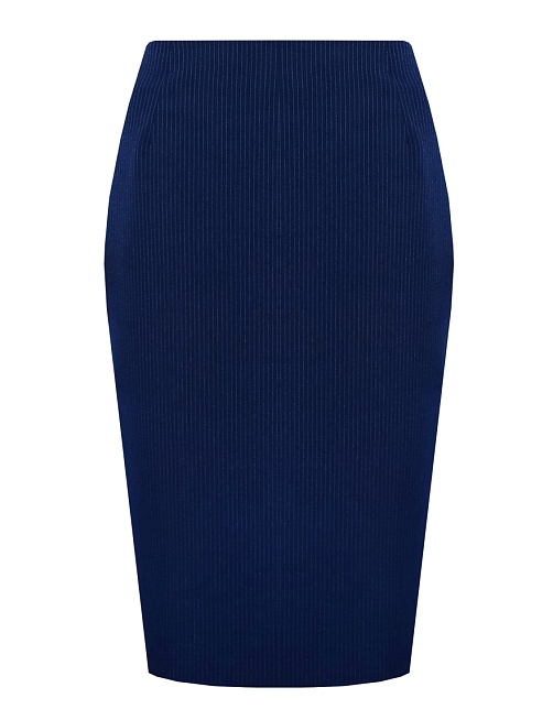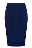Классическая юбка из поливискозной ткани темно-синего цвета в тонкую, почти невидимую полоску, слегка зауженная книзу, на внутренней обтачке без пояса, посадка средняя, застежка на потайную молнию в среднем шве спинки, сзади шлица, длина юбки миди - до середины колена, модель на подкладке. Поливискозная ткань - смесовая ткань, в состав которой входят волокна вискозы и полиэстера. Именно полиэстер придает ткани прочность, долговечность и опрятный внешний вид.