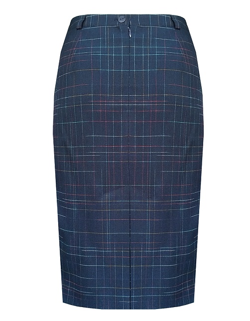 Классическая юбка слегка зауженная книзу темно-синего цвета из костюмной поливискозной ткани в тонкую, почти незаметную разноцветную клетку, на поясе со шлевками под ремень, посадка средняя, застежка на потайную молнию и пуговицу в среднем шве спинки, сзади шлица, длина юбки миди - до середины колена, модель на подкладке. Поливискозная ткань - смесовая ткань, в состав которой входят волокна вискозы и полиэстера. Именно полиэстер придает ткани прочность, долговечность и опрятный внешний вид.