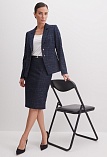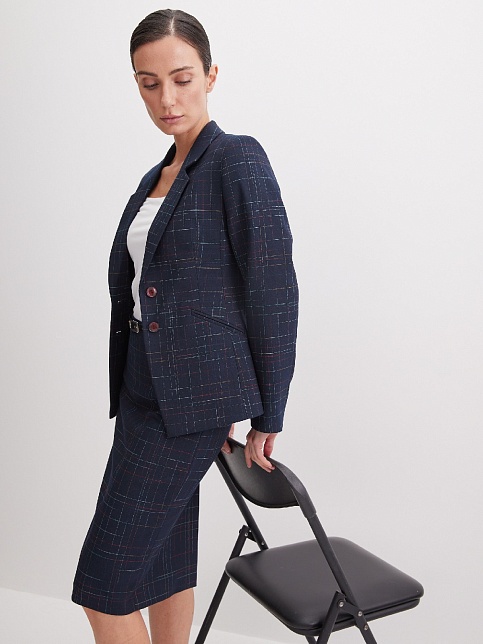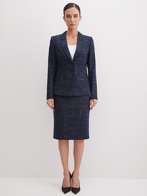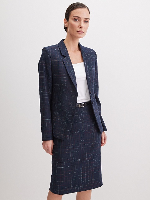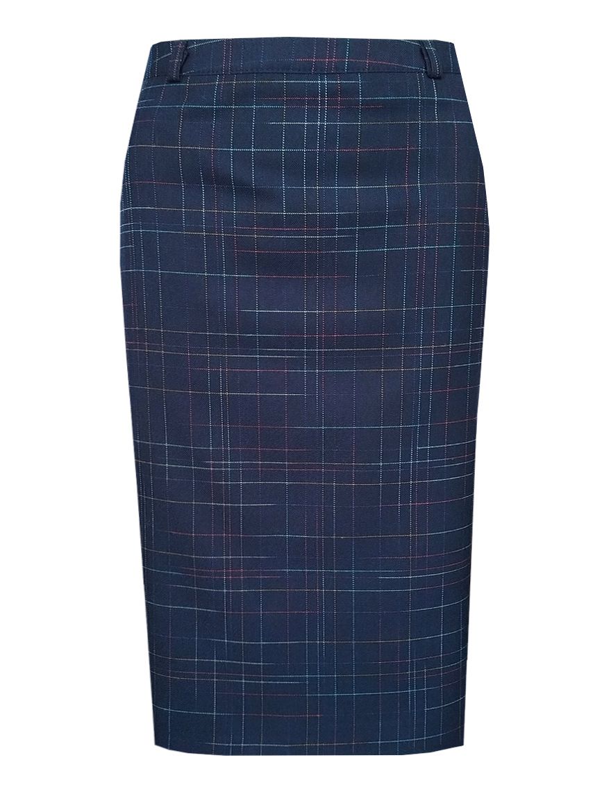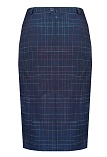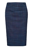 Классическая юбка слегка зауженная книзу темно-синего цвета из костюмной поливискозной ткани в тонкую, почти незаметную разноцветную клетку, на поясе со шлевками под ремень, посадка средняя, застежка на потайную молнию и пуговицу в среднем шве спинки, сзади шлица, длина юбки миди - до середины колена, модель на подкладке. Поливискозная ткань - смесовая ткань, в состав которой входят волокна вискозы и полиэстера. Именно полиэстер придает ткани прочность, долговечность и опрятный внешний вид.