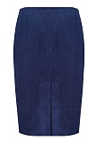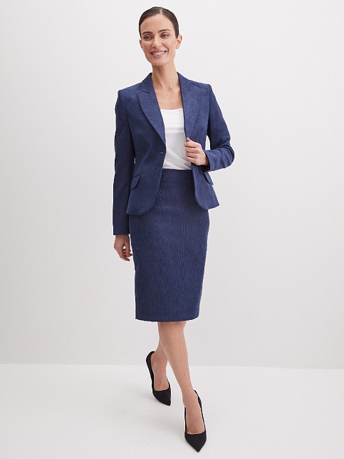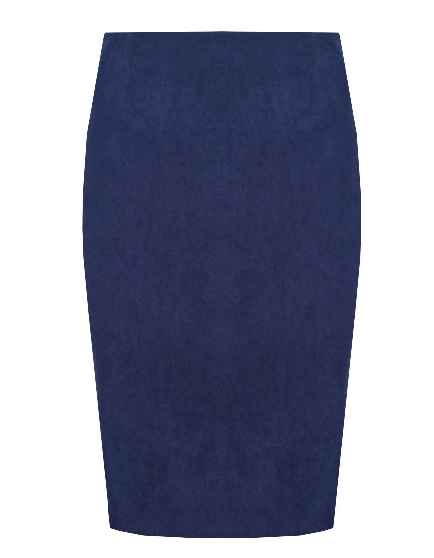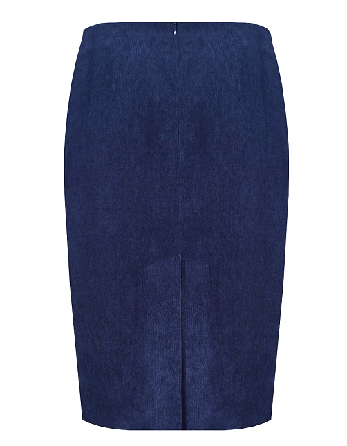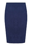 Классическая юбка из микровельвета в рубчик синего цвета слегка зауженная книзу, на внутренней обтачке без пояса,  посадка средняя, застежка на потайную молнию в среднем шве спинки, сзади шлица, длина юбки миди - до середины колена, модель на подкладке.