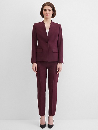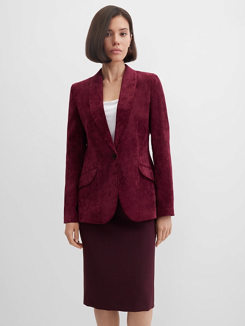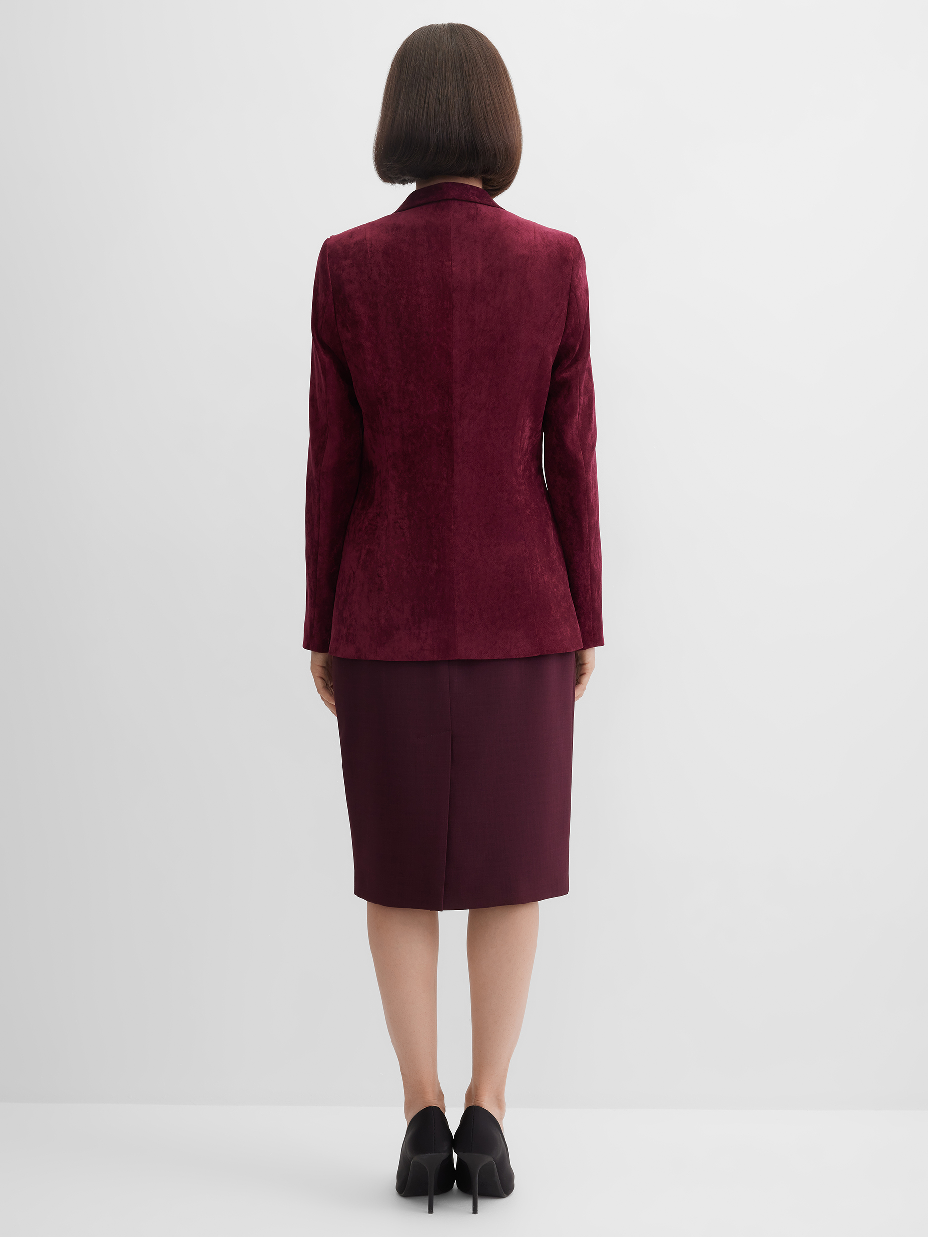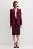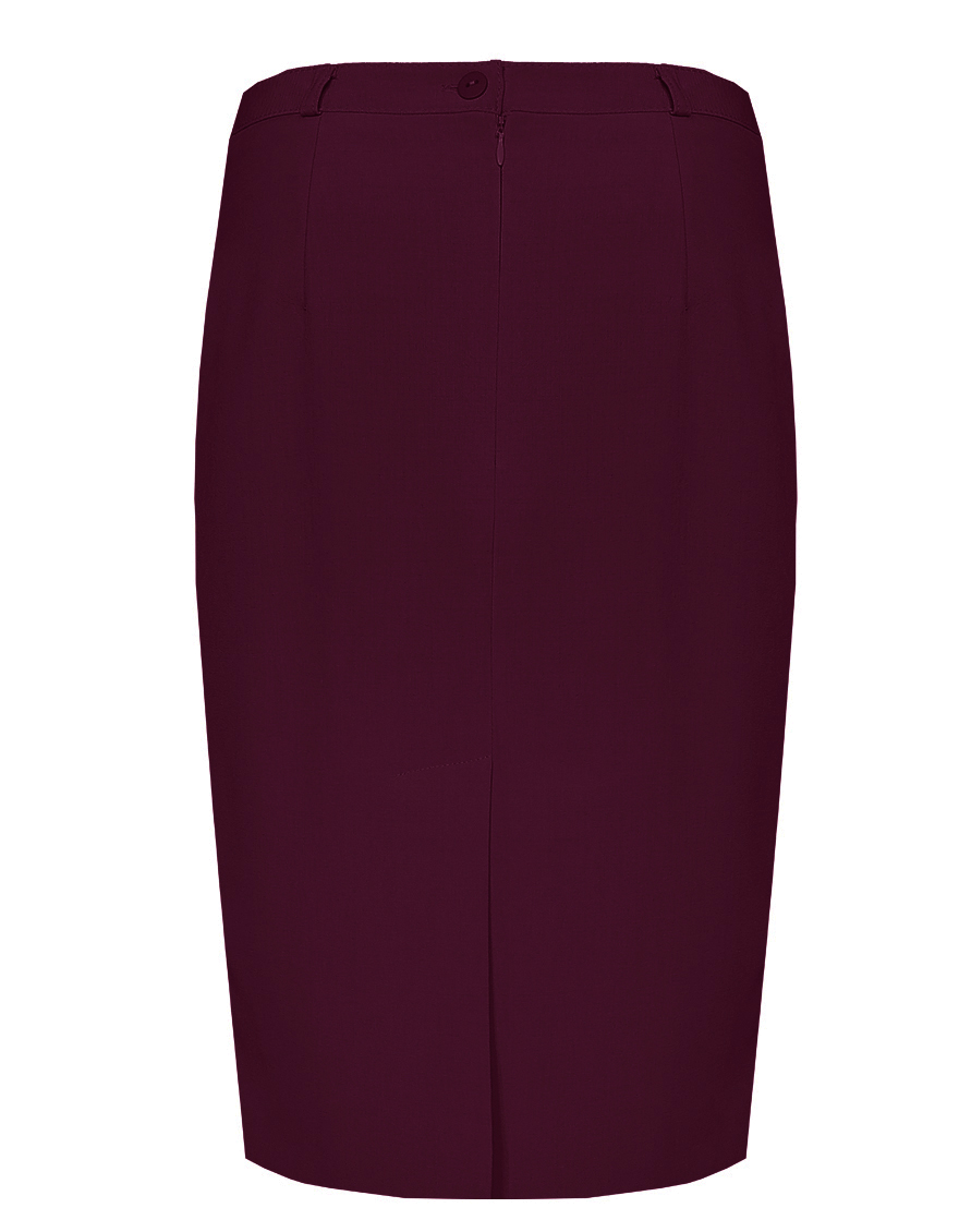Классическая юбка из поливискозной ткани в глубоком и насыщенном оттенке винного цвета, который сочетает в себе тепло красного, благородство бордового и интригу фиолетового, слегка зауженная книзу, на поясе со шлевками под ремень, посадка средняя, застежка на молнию и пуговицу в среднем шве спинки, сзади шлица, длина юбки миди - до середины колена, модель на подкладке. Поливискозная ткань - смесовая ткань, в состав которой входят волокна вискозы и полиэстера.