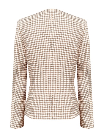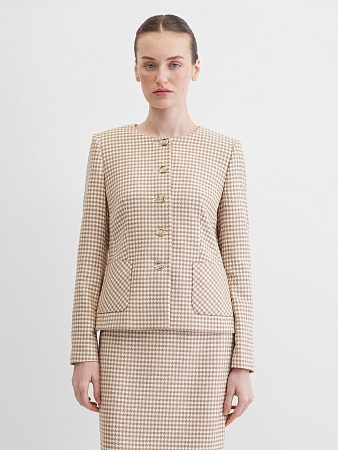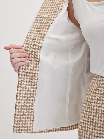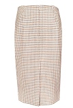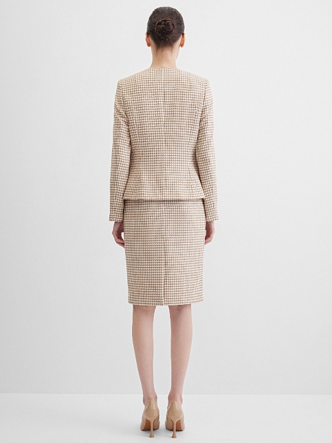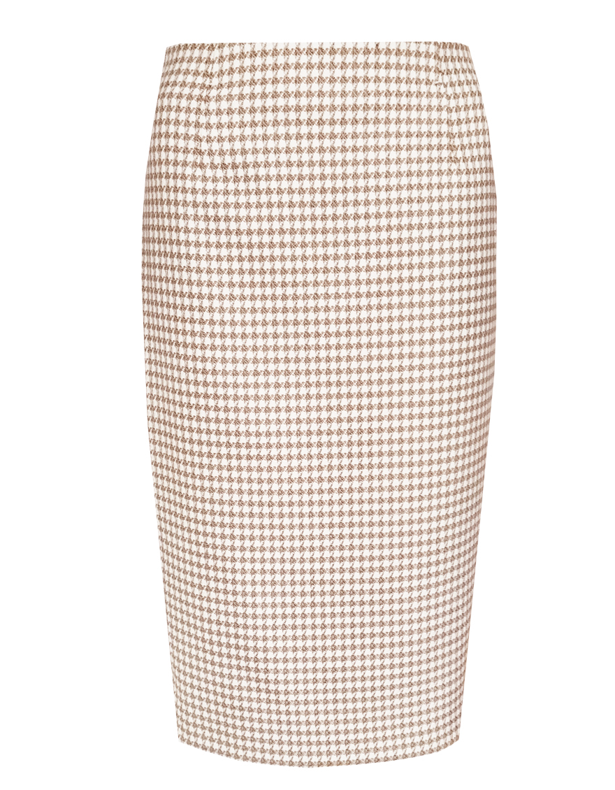 Классическая юбка с двухцветным геометрическим орнаментом пье де пуль ("гусиная лапка") в бежевом оттенке из поливискозной ткани, слегка зауженная книзу, на внутренней обтачке без пояса, посадка средняя, застежка на потайную молнию в среднем шве спинки, сзади шлица, длина юбки миди - до середины колена, модель на подкладке. Поливискозная ткань - смесовая ткань, в состав которой входят волокна вискозы и полиэстера. Именно полиэстер придает ткани прочность, долговечность и опрятный внешний вид.