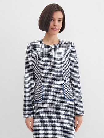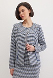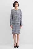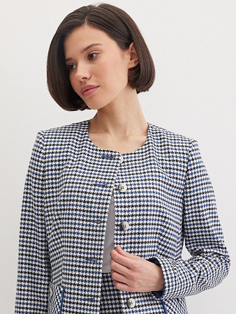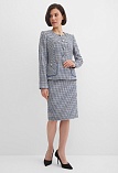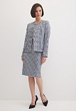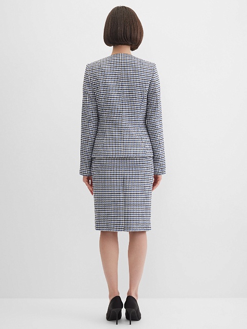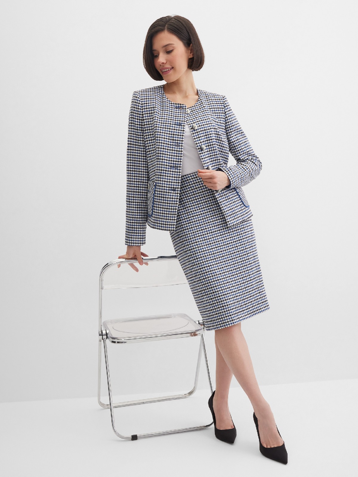 Классическая юбка из трехцветной поливискозной ткани с одним из самых неподвластных времени культовых узоров в моде "гусиная лапка" (пье-де-пуль) - геометрический орнамент из повторяющихся рядов ломаных клеток, слегка зауженная книзу, без пояса, на внутренней обтачке, посадка средняя, застежка на потайную молнию в среднем шве спинки, сзади шлица, длина юбки миди - до середины колена, модель на подкладке. Поливискозная ткань - смесовая ткань, в состав которой входят волокна вискозы и полиэстера.