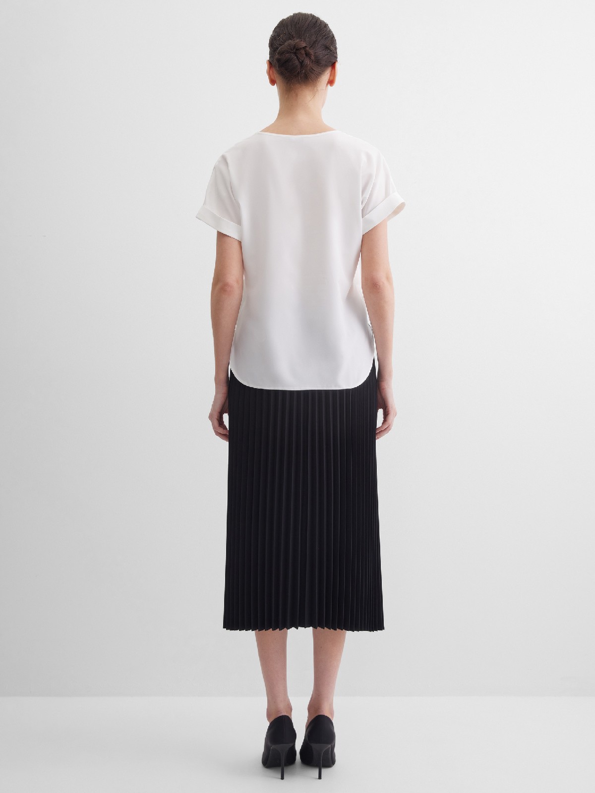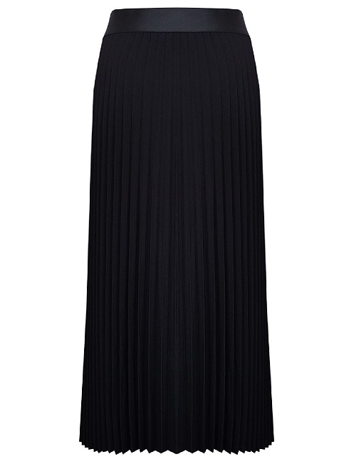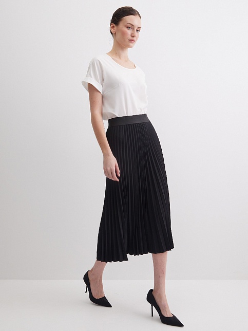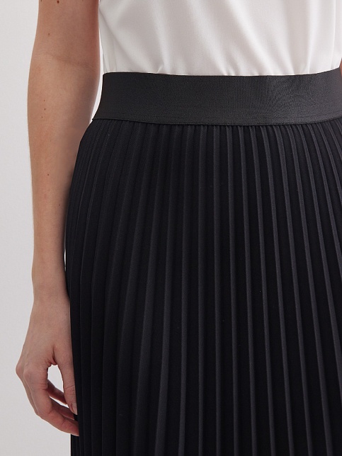 Черная юбка плиссе из поливискозной ткани с мягкими складками создающие объем, традиционный пояс по талии заменила эластичная резинка, которая отлично тянется, позволяет легко надеть юбку, не стесняет движений и делает ее идеальной для повседневной носки, без застежки, длина юбки макси - ниже колена, модель без подкладки. Она универсальна, подходит для многих типов фигур и любого сезона. Классический, универсальный вариант для офиса.