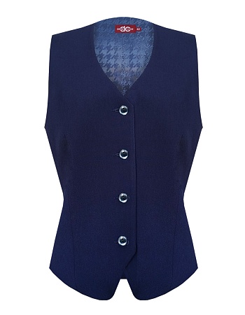 Короткий классический жилет в благородном и элегантном синем цвете под пиджак или как самостоятельное изделие под любую рубашку или блузку, однобортный, приталенный, застежка на пуговицы, v-образный вырез горловины, хлястики на спинке  позволяют регулировать ширину изделия по талии, модель без карманов и подкладки. Жилет выполнен из поливискозной ткани - смесовая ткань, в состав которой входят волокна вискозы и полиэстера. Именно полиэстер придает ткани прочность, долговечность и опрятный вид.