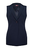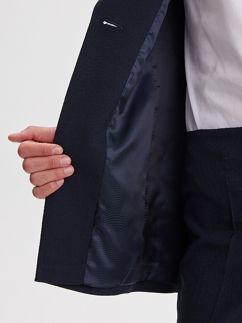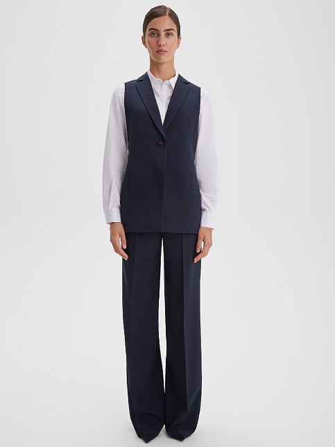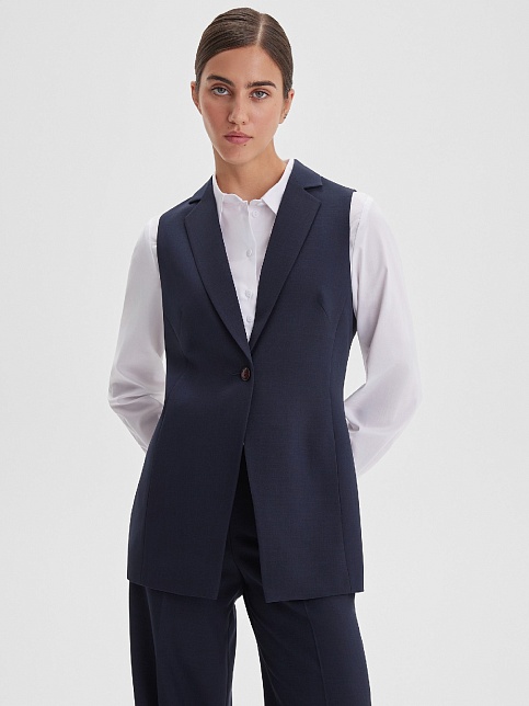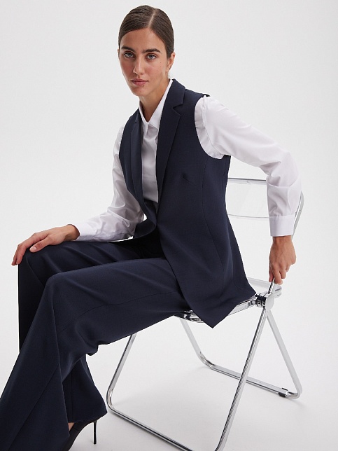 Элегантный жилет благородного синего цвета из костюмной поливискозной ткани, комфортная длина прикрывающая бедра, приталенный, однобортный, английский воротник, внутренние карманы в рельефе почти незаметны и не нарушают внешний вид изделия, застежка на одну пуговицу, модель на подкладке синего цвета. Поливискозная ткань - это смесовая ткань, в состав которой входят волокна вискозы и полиэстера. Именно полиэстер придает ткани прочность, долговечность и опрятный внешний вид.