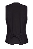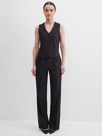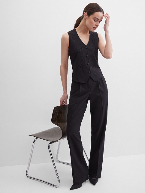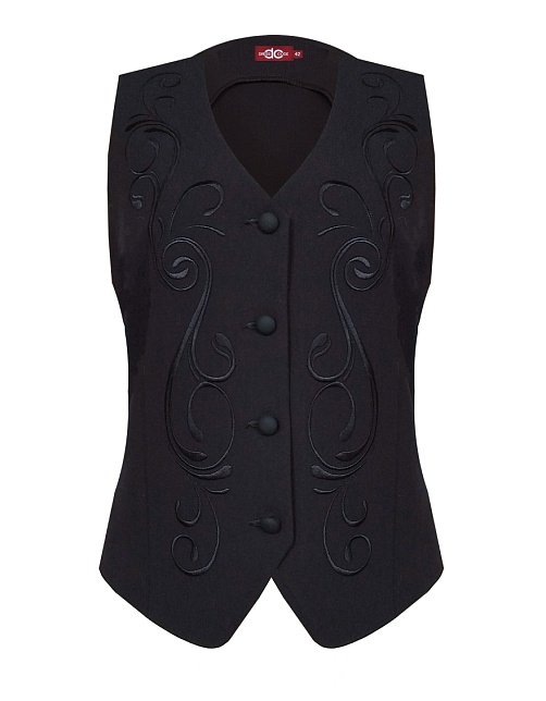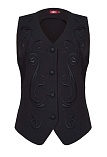 Короткий классический жилет из премиальной костюмной ткани высокого качества в базовом черном цвете с ажурной вышивкой по переду в цвет основной ткани, вышивка выполнена шелковыми нитками и придает изделию дорогой эффектный вид, жилет под пиджак или как самостоятельное изделие под любую рубашку или блузку, однобортный, приталенный, застежка на пуговицы, v-образный вырез горловины, хлястики на спинке позволяют регулировать ширину изделия по талии, модель без карманов и подкладки.