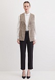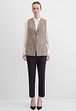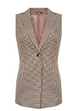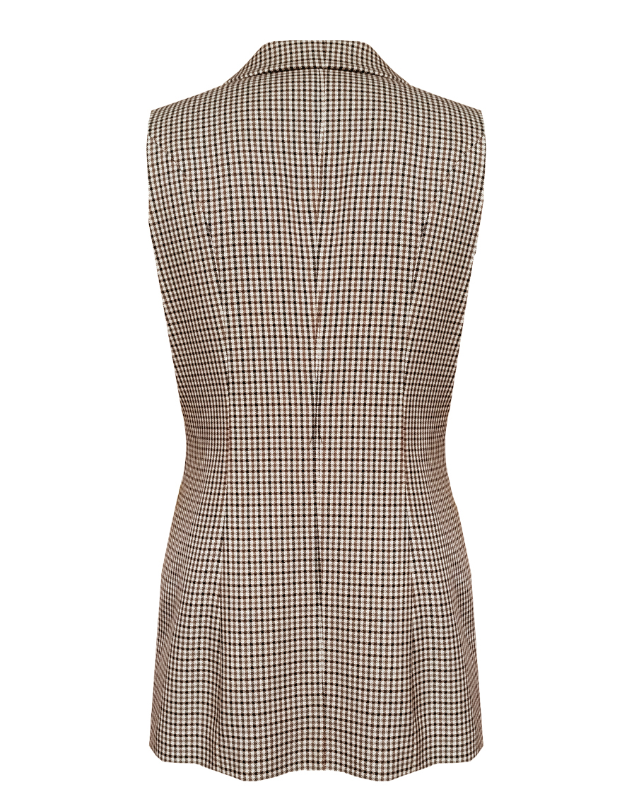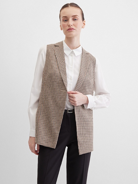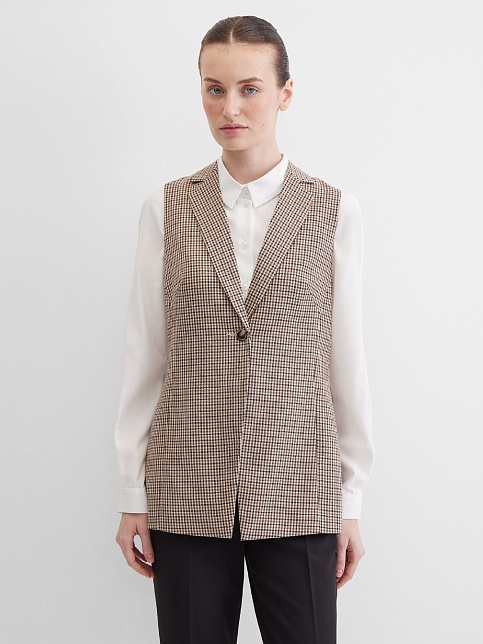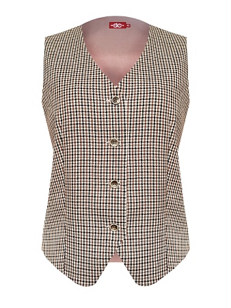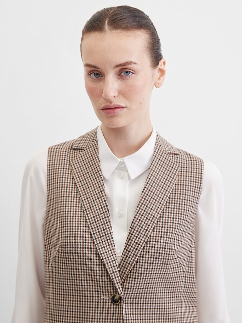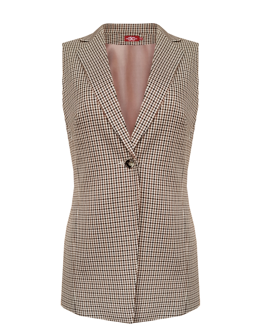 Стильный жилет в клетку в классической и элегантной цветовой гамме: песочный, коричневый и черный. Песочный добавляет теплоту, коричневый благородство, а черный строгость и выразительность, такое сочетание подходит для создания стильного и утонченного образа. Комфортная длина  прикрывающая бедра, приталенный, однобортный, английский воротник, внутренние карманы в рельефе почти незаметны, застежка на одну пуговицу, модель на подкладке. Модель выполнена из поливискозной ткани.