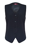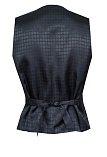 Короткий классический жилет из костюмной ткани в базовом черном цвете по передней части и гладкой подкладочной ткани по спинке, благодаря такой комбинации жилет стал более легким и комфортным в носке, сохраняя при этом классический внешний вид, однобортный, приталенный, застежка на пуговицы, v-образный вырез горловины, хлястики на спинке позволяют регулировать ширину изделия по талии, модель без карманов, полочка на подкладке по изнаночной стороне.