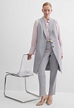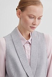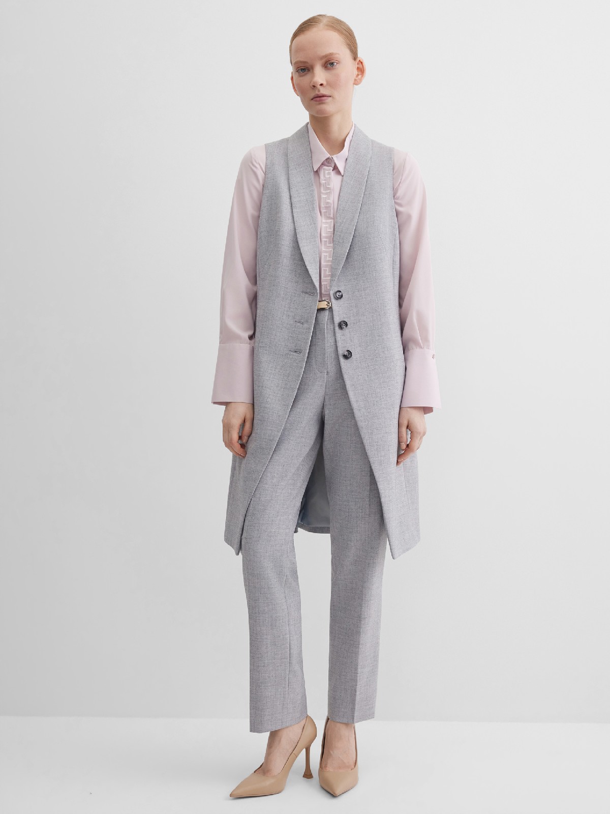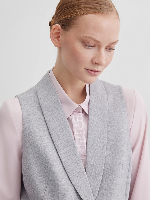 Универсальный базовый жилет из поливискозной ткани в мягком и нейтральном оттенке серого с легким меланжевым эффектом, идеальная длина до середины колена, приталенный, однобортный, горловину украшает шалевый воротник, функциональные карманы в рельефе, которые почти незаметны, застежка на пуговицы, модель на подкладке. Поливискозная ткань -  смесовая ткань , в состав которой входят волокна вискозы и полиэстера, именно полиэстер придает ткани прочность, долговечность и опрятный внешний
