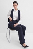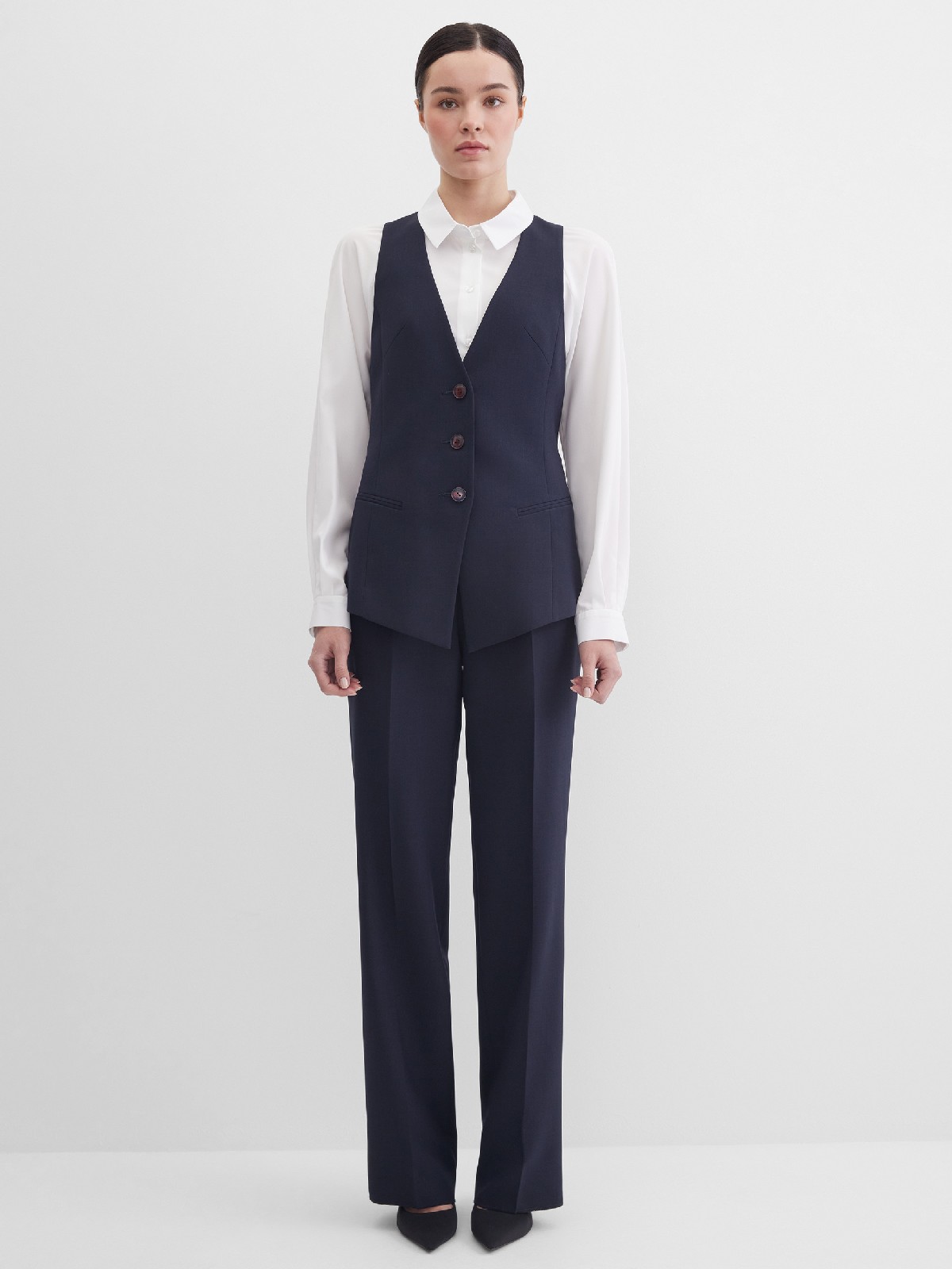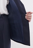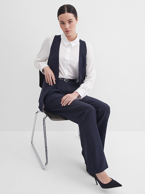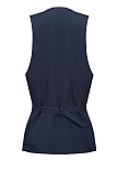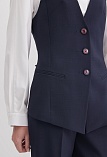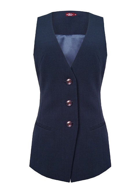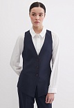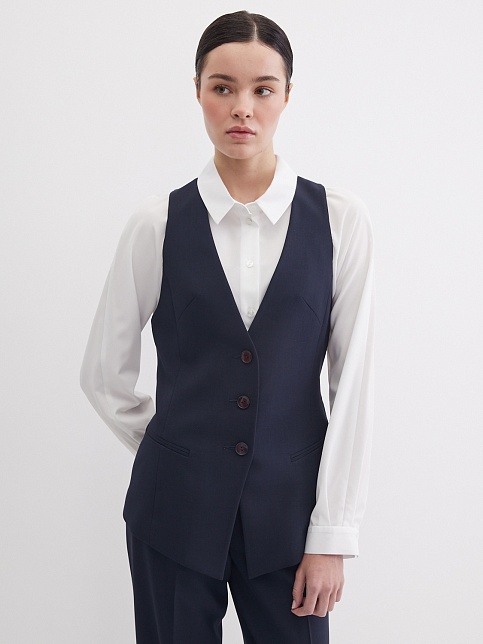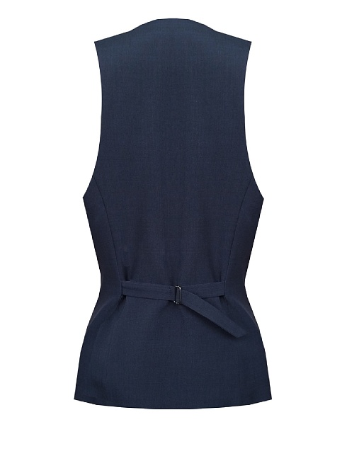 Классический жилет из костюмной ткани высокого качества темно-синего цвета, который считается универсальным в базовом гардеробе и служит основой для многих стильных образов, средняя длина, приталенный, однобортный, V-образный вырез горловины, небольшие карманы в рамку, хлястики на спинке позволяют регулировать ширину изделия по талии, застежка на пуговицы, модель  полностью на подкладке.