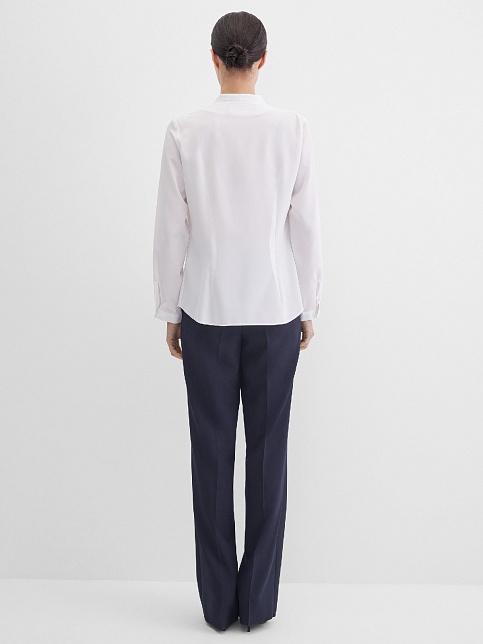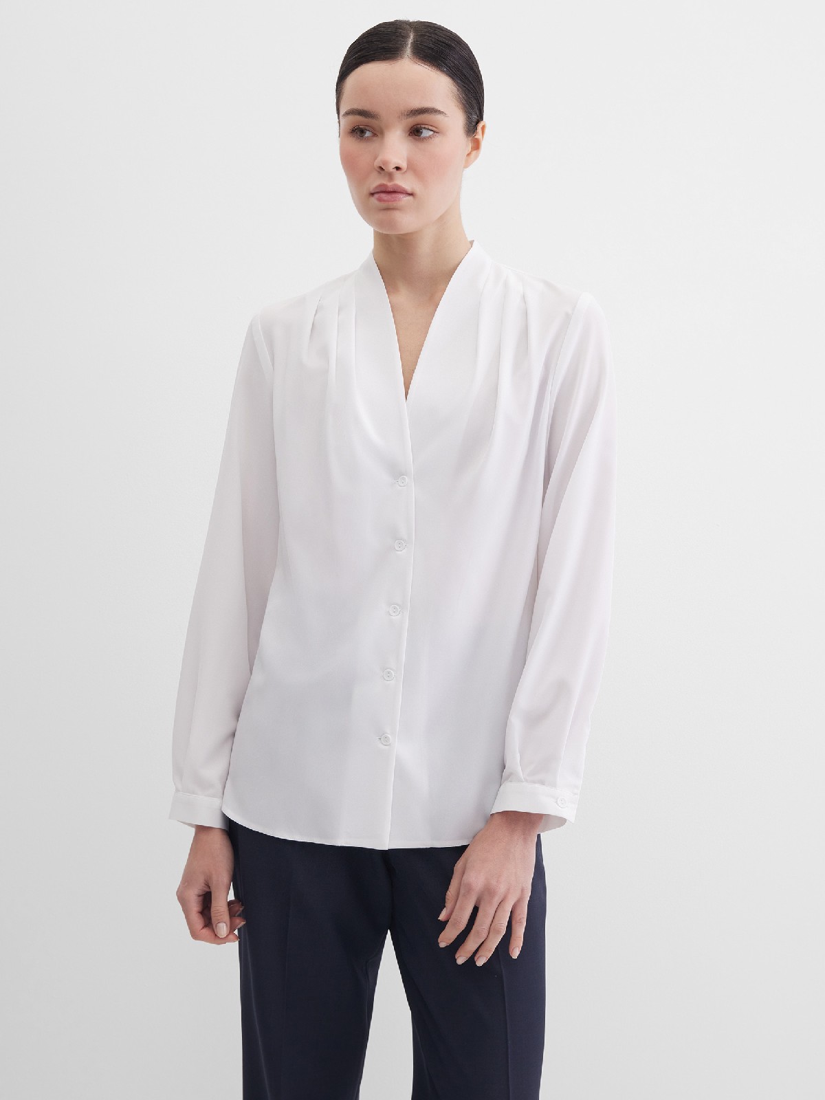 Легкая белоснежная блуза из мягкой поливискозной ткани средней длины, ткань приятная на ощупь и проста в уходе, приталенный силуэт, V-образная горловина с цельнокроенным воротником и застроченными складками от плеча, застежка на мелкие пуговицы в цвет ткани, длинный втачной рукав на манжете.