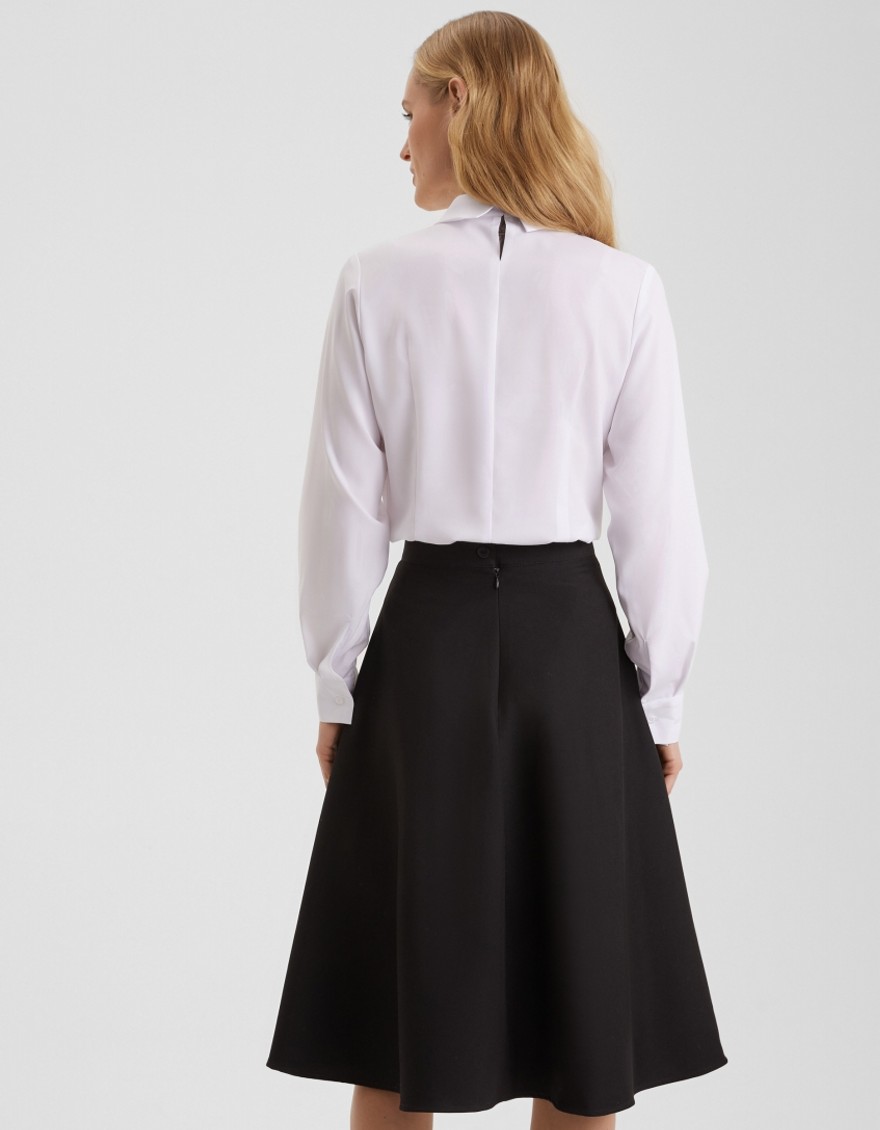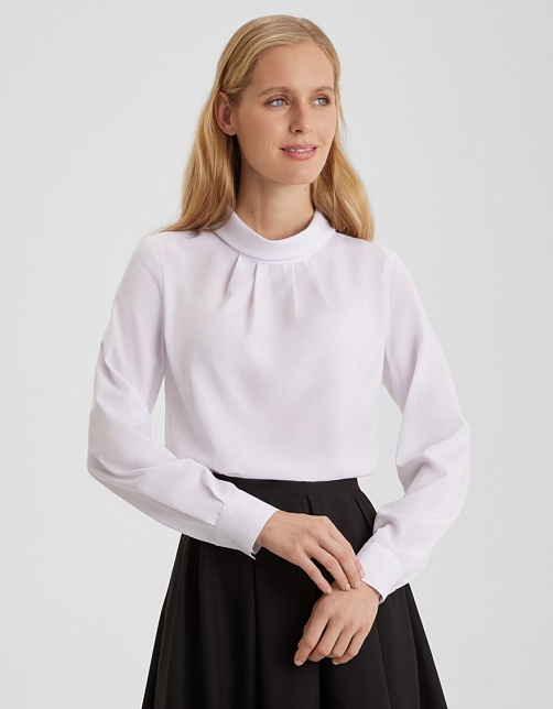 Белоснежная блуза из легкой вискозной ткани  средней длины, приталенная, по передней части горловины заложены мягкие складки, воротник-хомут, сзади застежка-капелька на мелкие пуговицы, длинные втачные рукава.