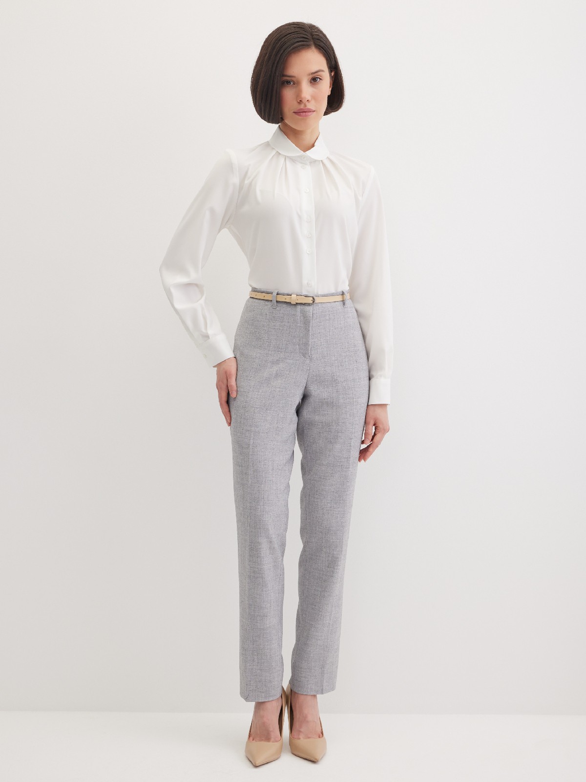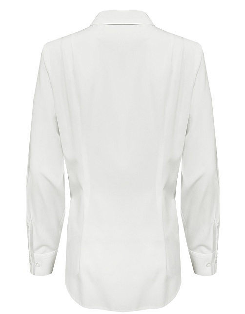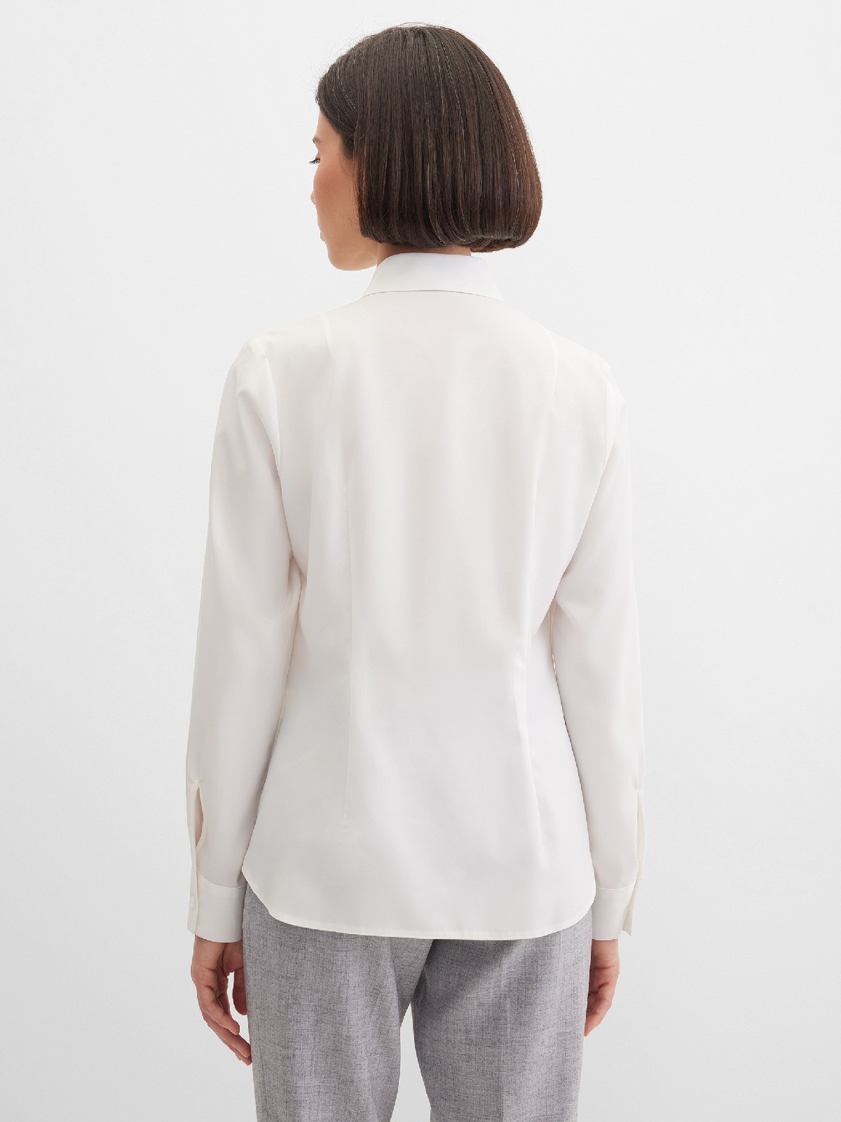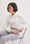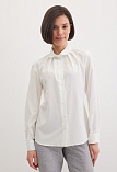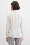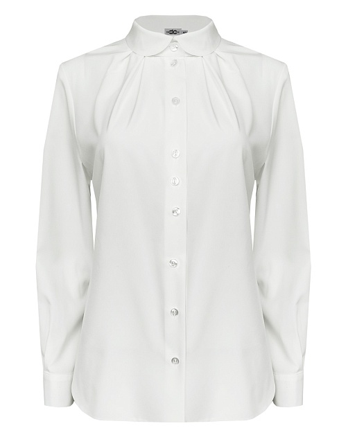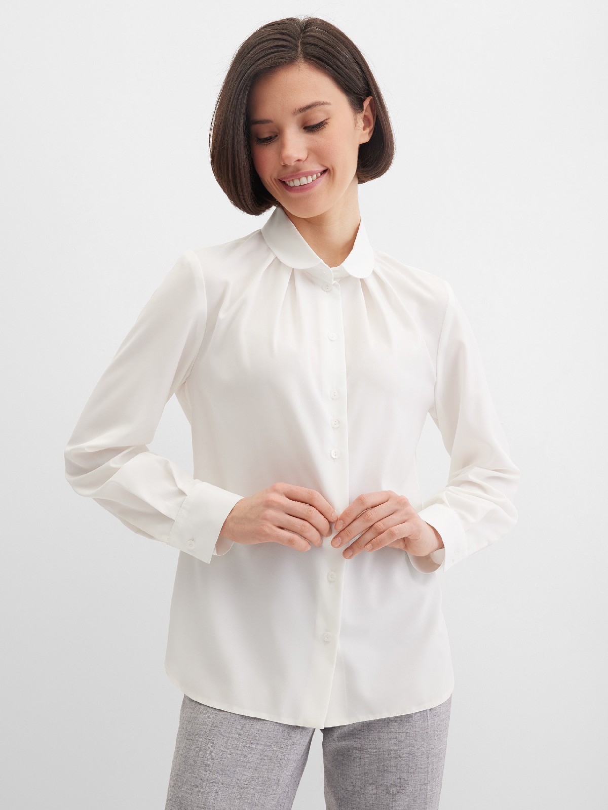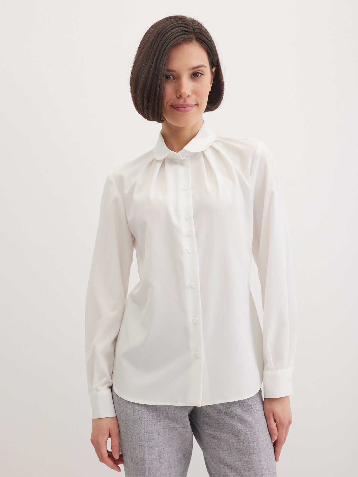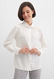 Струящаяся блузка из шелковистой вискозы  средней длины, слегка приталенная, по горловине заложены складки, рубашечный воротник на стойке, застежка на мелкие пуговицы, длинный рукав .