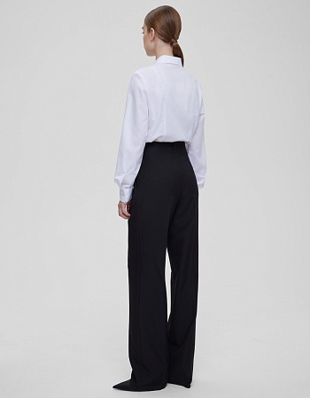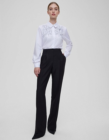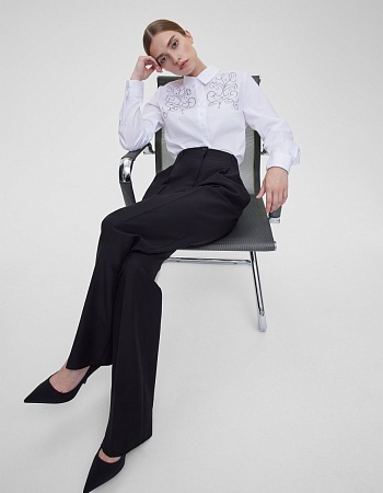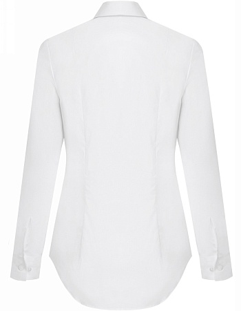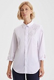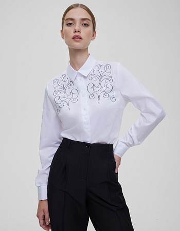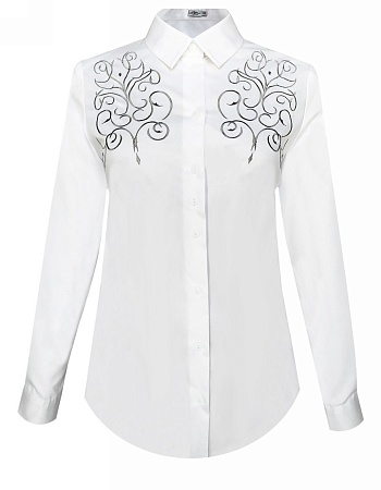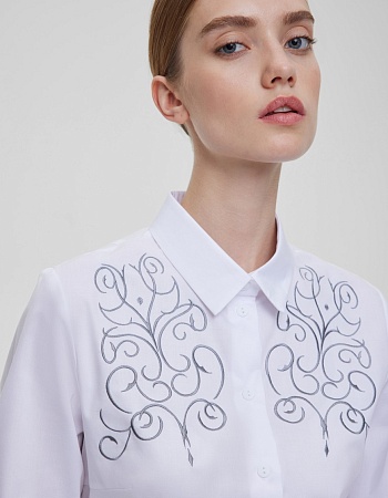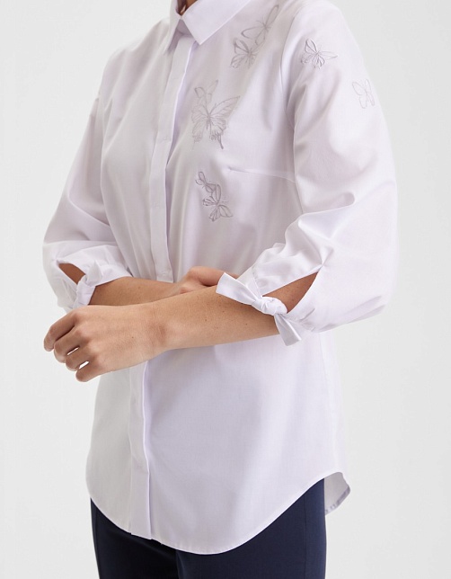 Рубашка из белой  сорочечной ткани с нежной вышивкой  в виде бабочек, выполненной шелковыми нитками жемчужного цвета, высокое качество хлопка, приталенный силуэт, рубашечный отложной воротник, потайная застежка на мелкие пуговицы, модель удлиненная с фигурным низом, длина втачного рукава 3/4 с декоративным элементом в виде завязок.
