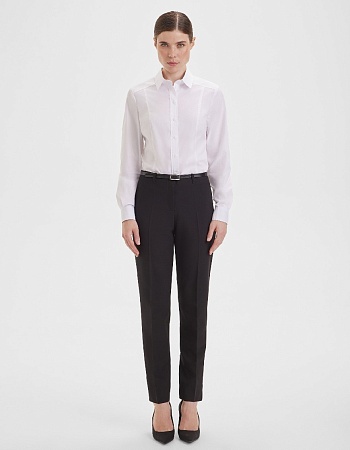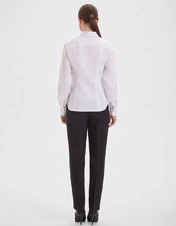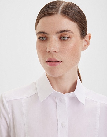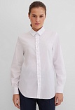 Блузка рубашка из белой  сорочечной ткани украшена  знаковым Меандровым узором, который воплотился в вышивке по планке, вид застежки  супатная -  внутренняя застежка на пуговицы, приталенный силуэт, рубашечный отложной воротник, модель удлиненная с фигурным низом, длинный втачной рукав с  манжетом с застежкой на пуговицу.