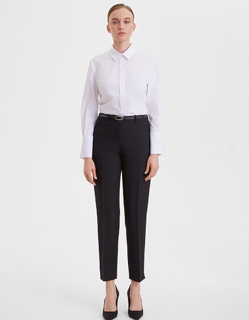 Блузка рубашка из белой сорочечной ткани высокого качества, вид застежки  супатная - внутренняя застежка на пуговицы, которые спрятаны между слоями ткани и не видны, приталенность за счет вытачек по спинке, отсутствие талиевых вытачек по переду придает дополнительную свободу и комфорт в носке, рубашечный отложной воротник на стойке, модель удлиненная с фигурным низом, длинный втачной рукав с высоким манжетом и застежкой на одну пуговицу.