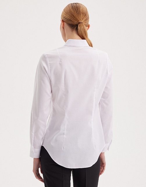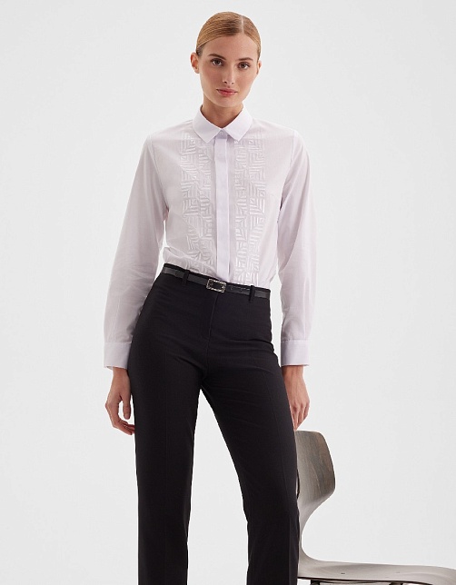 Блузка рубашка из белой сорочечной ткани средней плотности с меандровым орнаментом - в виде беспрерывных ломаных линий, похожие на извилистую реку Меандр, застежка супатная - потайная застежка на пуговицы, которые спрятаны между слоями ткани и не видны, приталенный силуэт, рубашечный отложной воротник, модель удлиненная с фигурным низом, длинный втачной рукав на  манжете с застежкой на пуговицу.