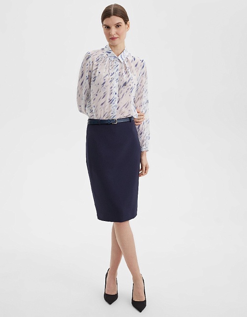 Эффектная блуза из воздушного и полупрозрачного материала с нежным акварельным принтом, вдохновленный живописными красками природы и выглядит как мазки акварели в лаконичном сочетании белого c синим. Модель приталенная, средняя длина, рубашечный воротник, по горловине спереди заложены мягкие складки, застежка на пуговицы, длинный втачной рукав на манжете с петлей и пуговицей. Акварель отлично подходит фигурам пюс-сайз, так как визуально уменьшает объемы и создает более стройный силуэт.