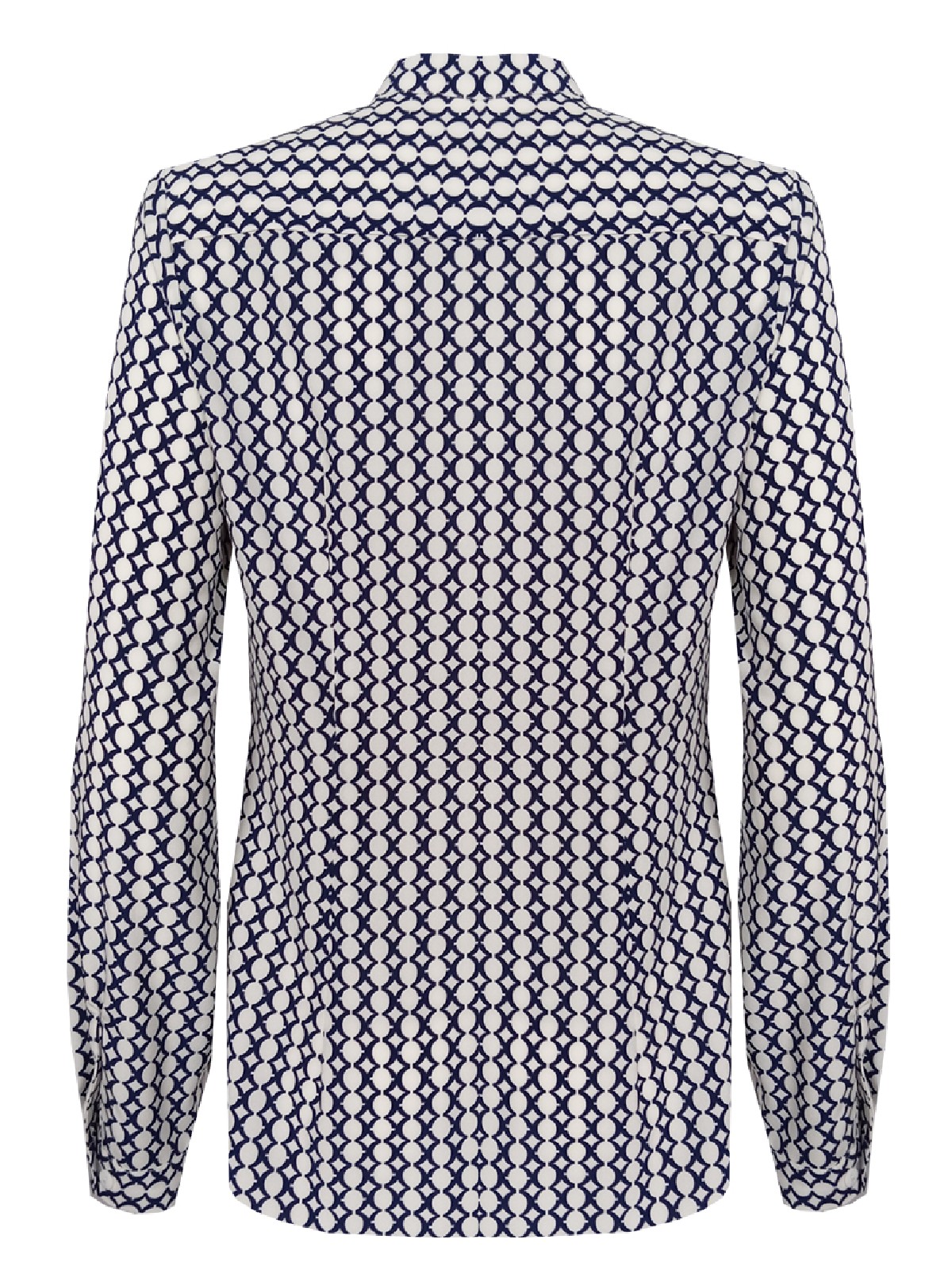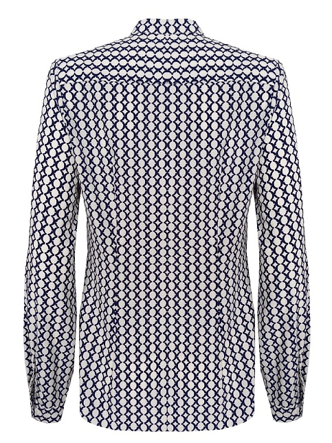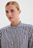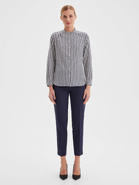 Элегантный вид блузы из шелковистой поливискозной ткани с темно-синим  графическим рисунком на нежном фоне очаровывает и подчеркивает женственность образа, средняя длина, приталенная, воротник стойка, по цельнокроенной кокетке спереди заложены мягкие складки, застежка на пуговицы, длинный втачной рукав на  манжете с петлей и пуговицей. Ткань очень мягкая, тонкая и приятная к телу.